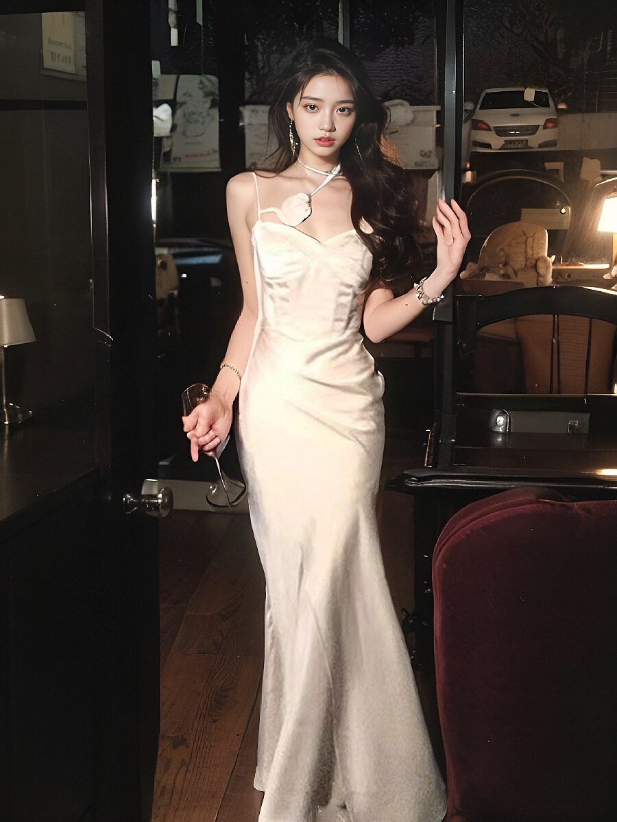 📚 缎面连衣裙生日长裙子高级聚会设计性感挂脖法式party小礼服显瘦