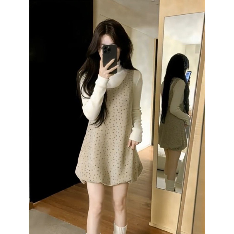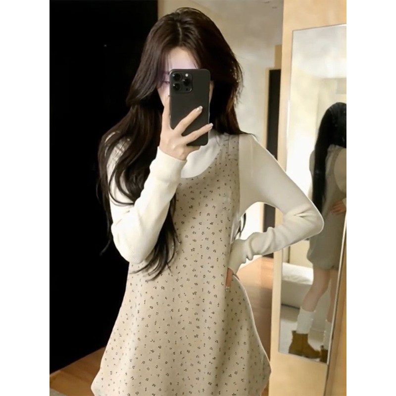 📚 春秋氛围感学院风杏色针织打底衫叠穿减龄碎花背心花苞裙两件套装