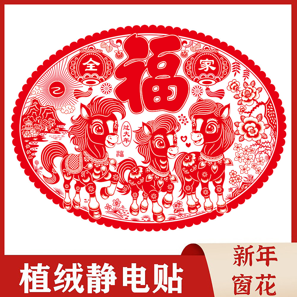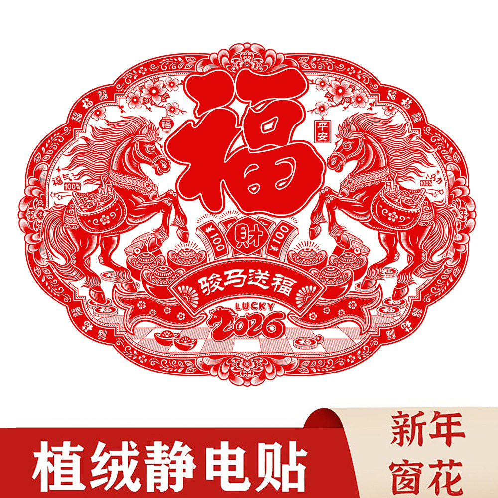 📚 马年窗花剪纸福字2026特大号植绒窗花静电贴新年玻璃贴过年元旦