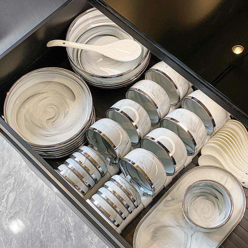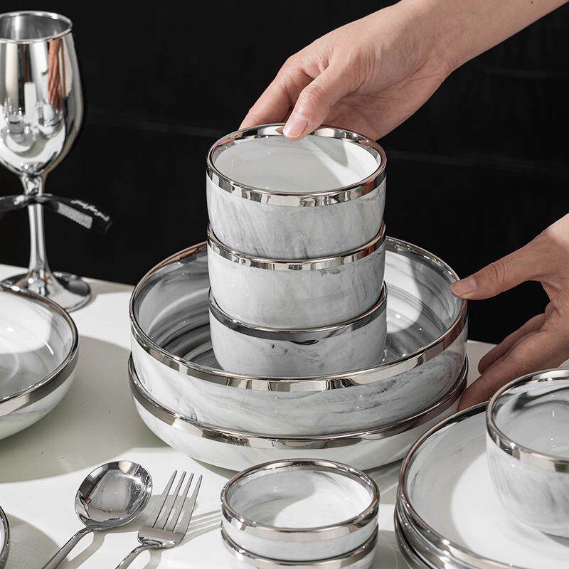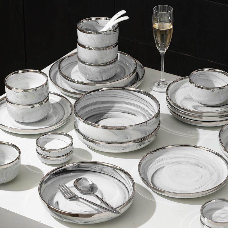 📚 高级感银边大理石纹碗碟套装家用陶瓷碗筷碗盘子组合乔迁餐具全套