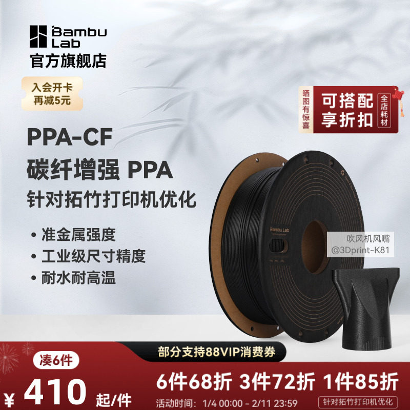 68¥ CZ321 KMl8UlCi7GL¥ https://m.tb.cn/h.7E5FFl8 拓竹PPA-CF碳纤增强 3D打印耗材 耐高温尼龙耐水 高精度强度-净重750g --------------------- 【原售价】649元 【现售价】603元。