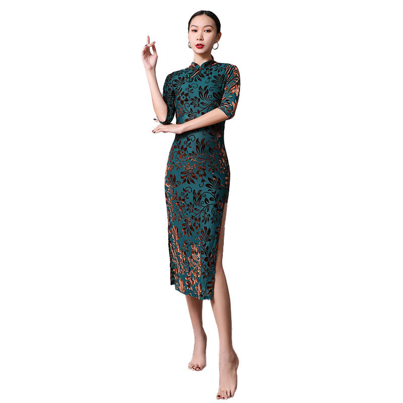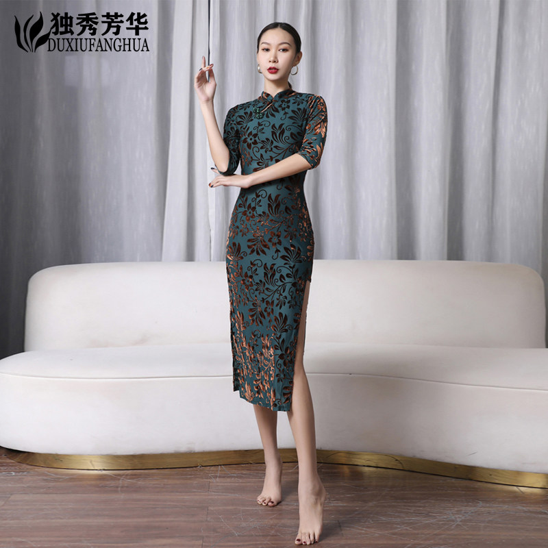 📚 古典舞旗袍弹力舞蹈服春秋植绒显瘦长裙民国风开叉旗袍拉丁演出服