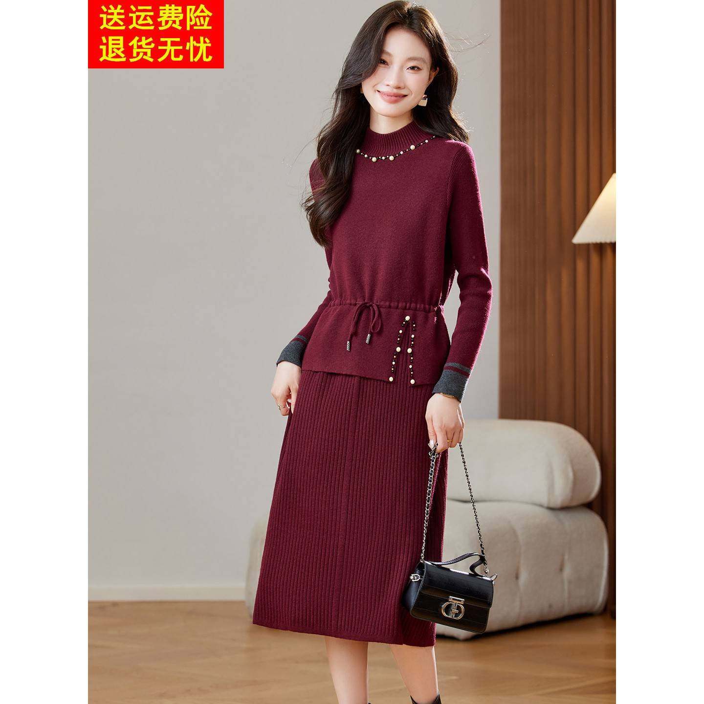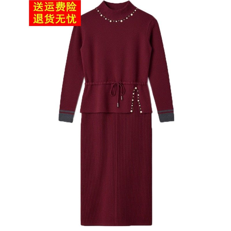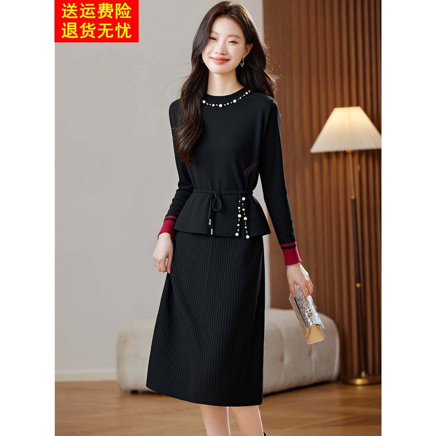 📚 针织显瘦连衣裙女秋冬季新款长袖半高领短款上衣半身裙两件套装裙