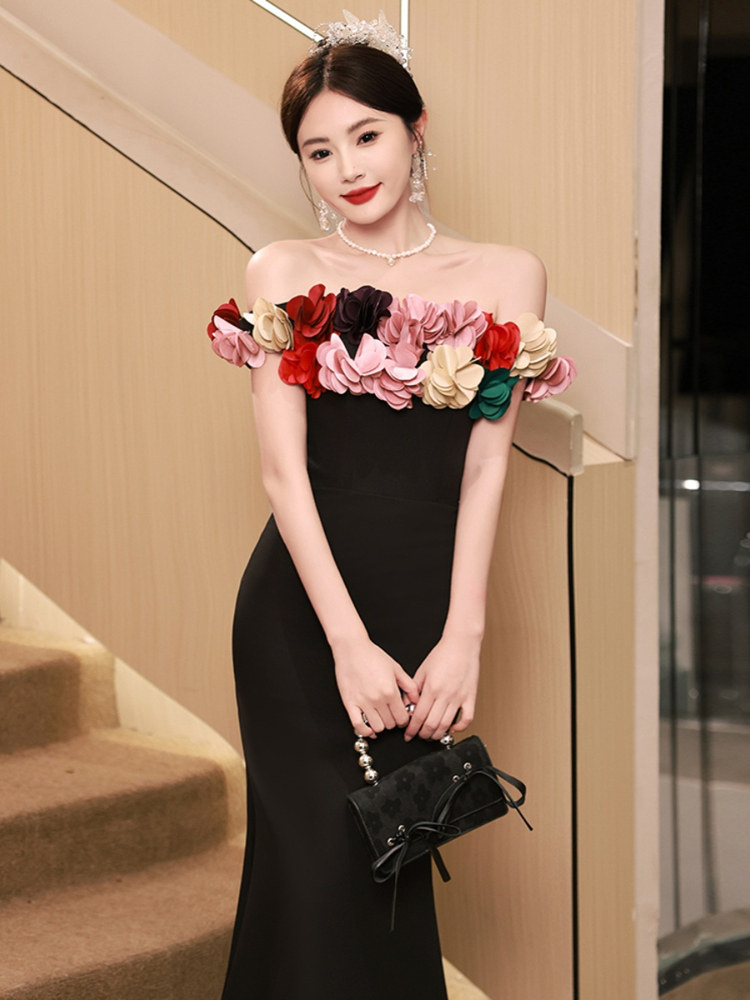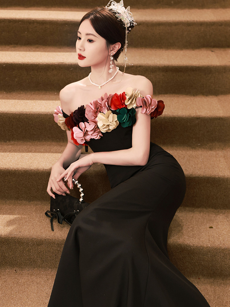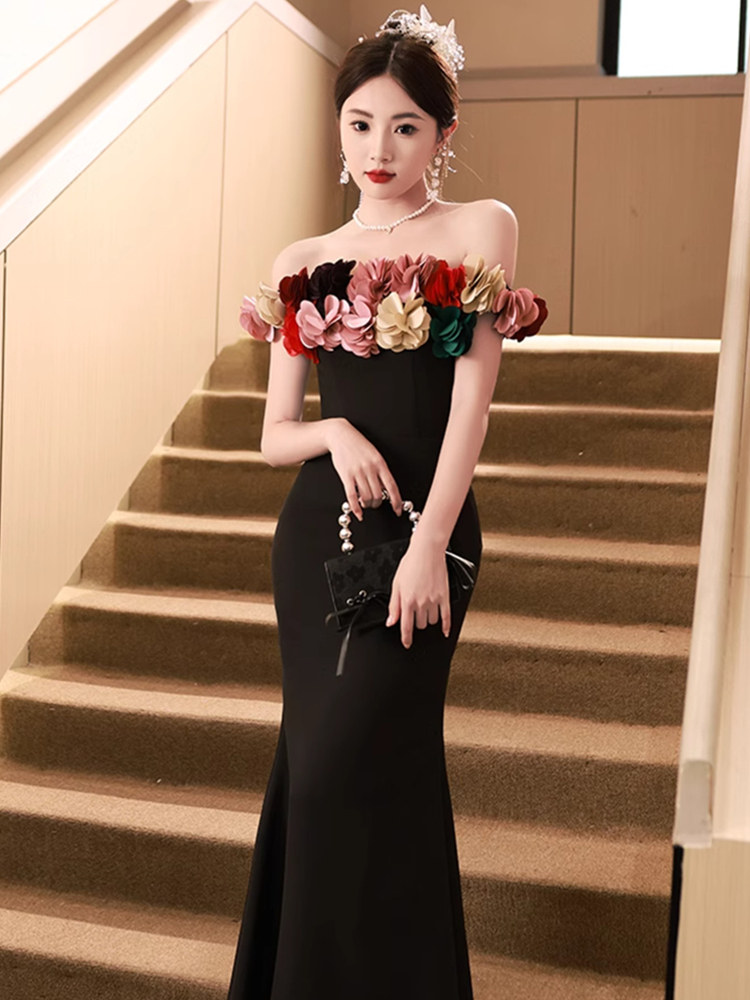 📚 年会战袍party小礼服高端轻奢小众生日宴会敬酒服黑色抹胸连衣裙