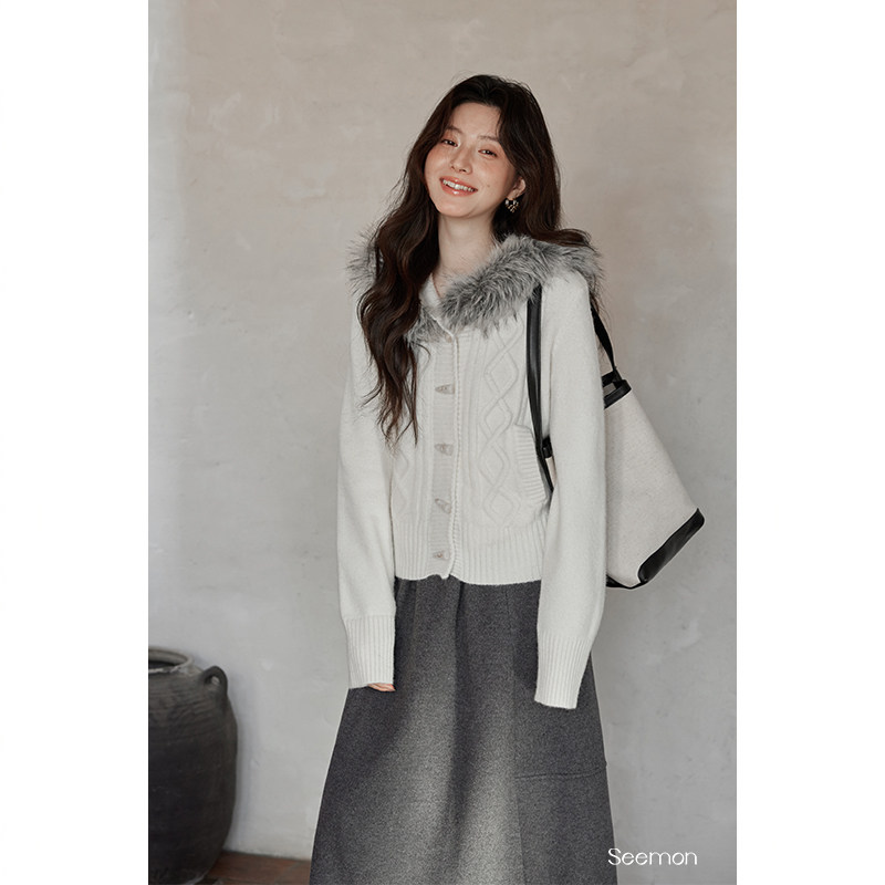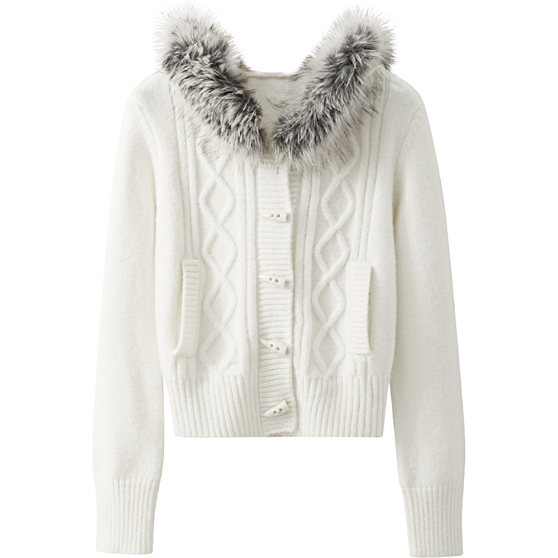 📚 夕蒙2025新款冬季韩系气质上衣软糯小个子绝美牛角扣白色毛领毛衣
