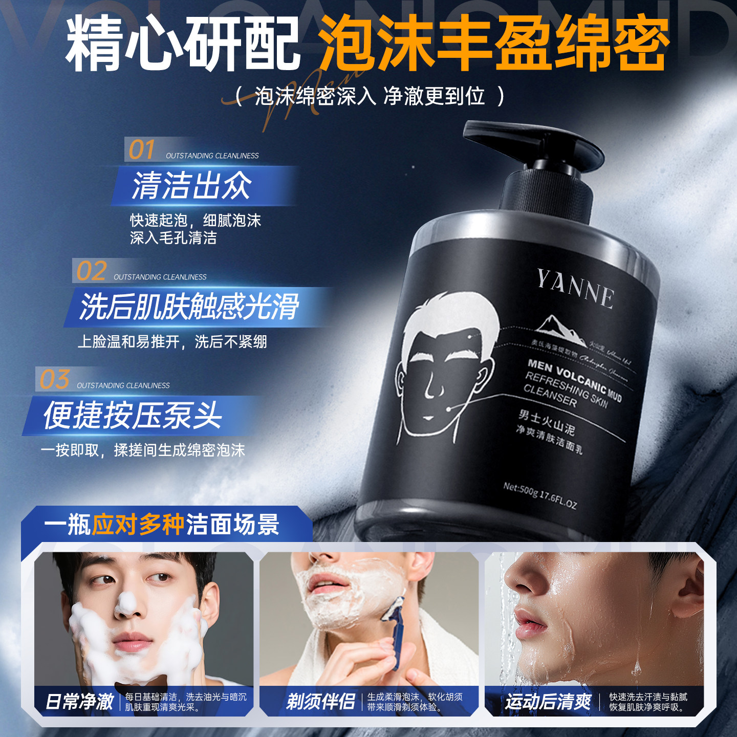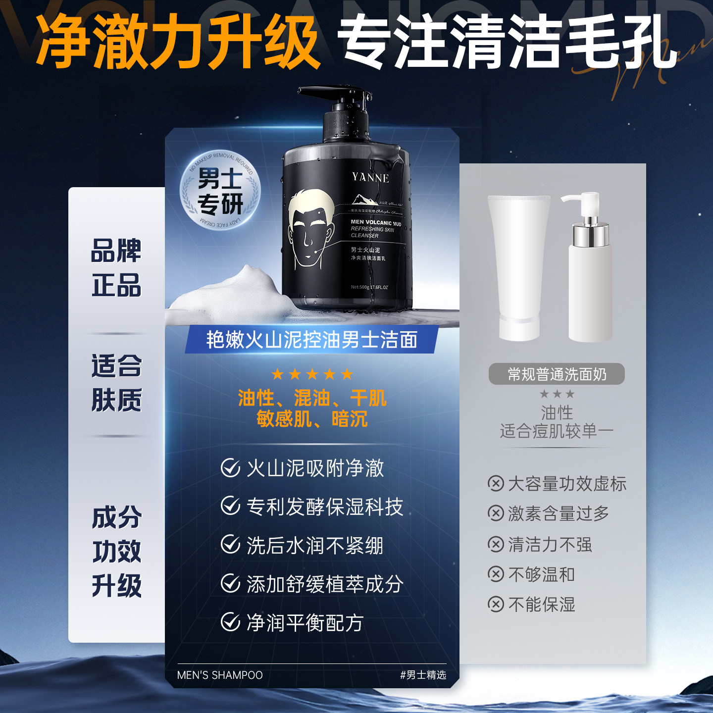 📚 男士专用火山岩洗面奶清爽控油去油补水保湿收缩毛孔深层清洁面乳