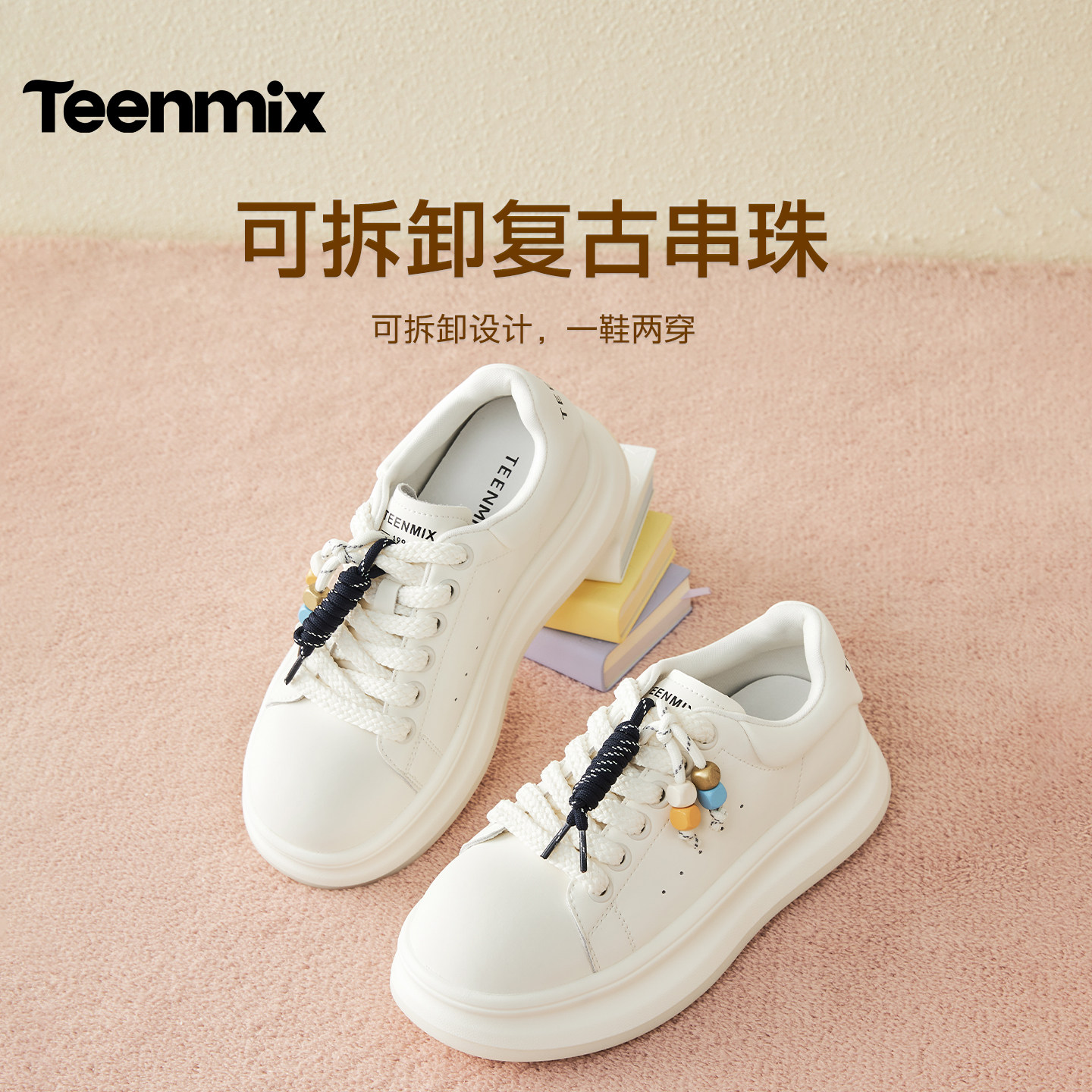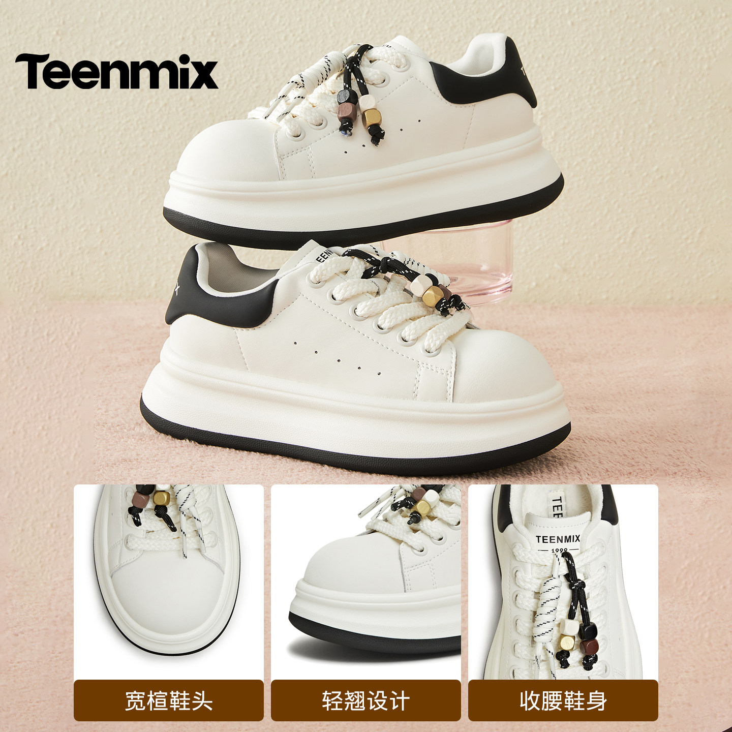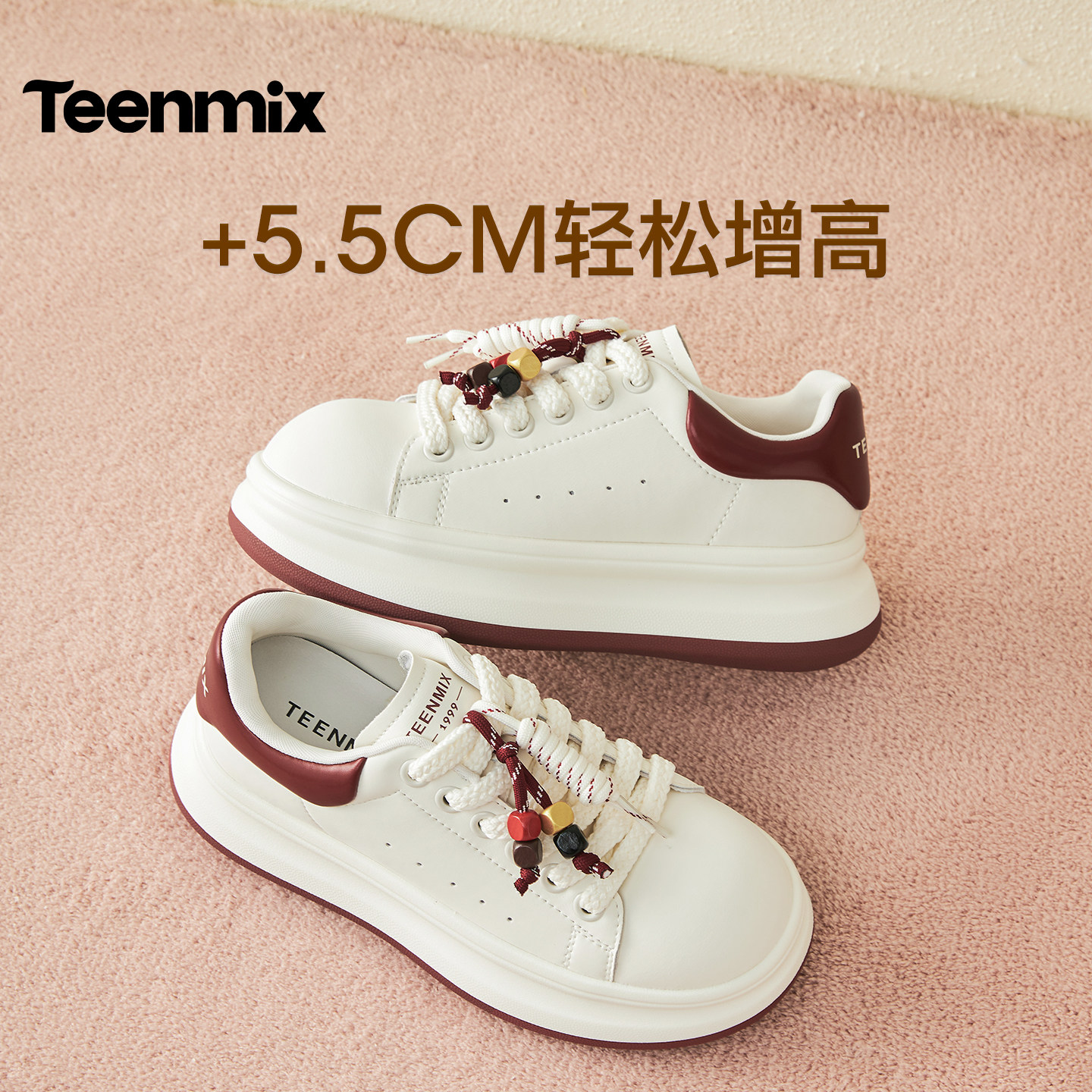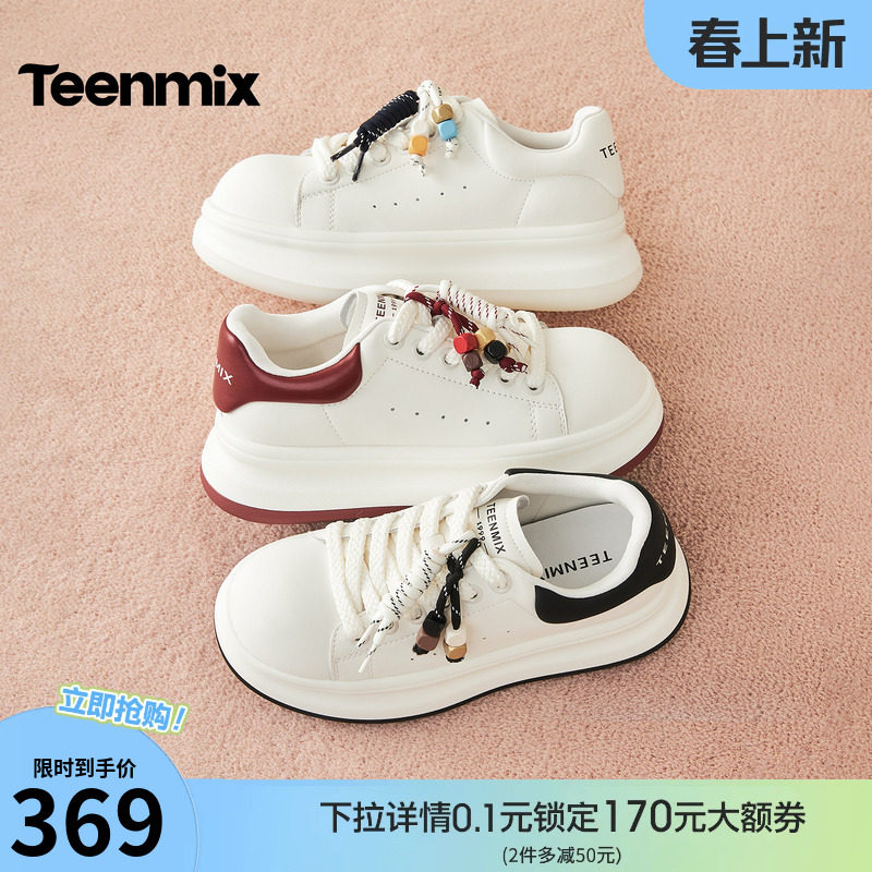 📚 天美意串珠厚底增高面包小白鞋红色运动板鞋女鞋子秋季新款休闲鞋
