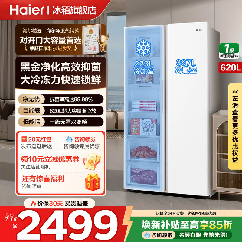 📚 海尔冰箱620升对开双开门一级能效家用变频无霜超大容量官方正品