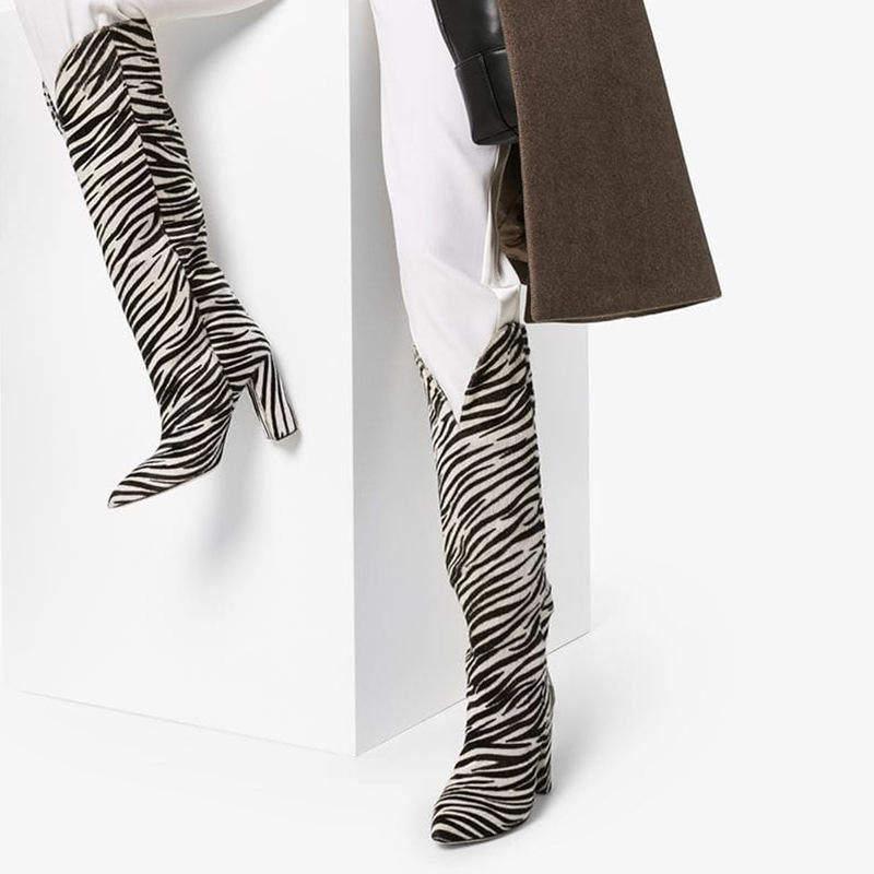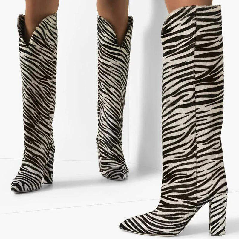 📚 欧美女士斑纹马毛粗高跟尖头一脚蹬及膝靴外贸款大码女鞋时装靴