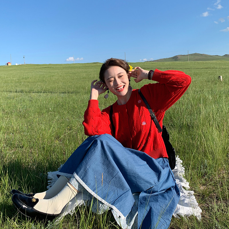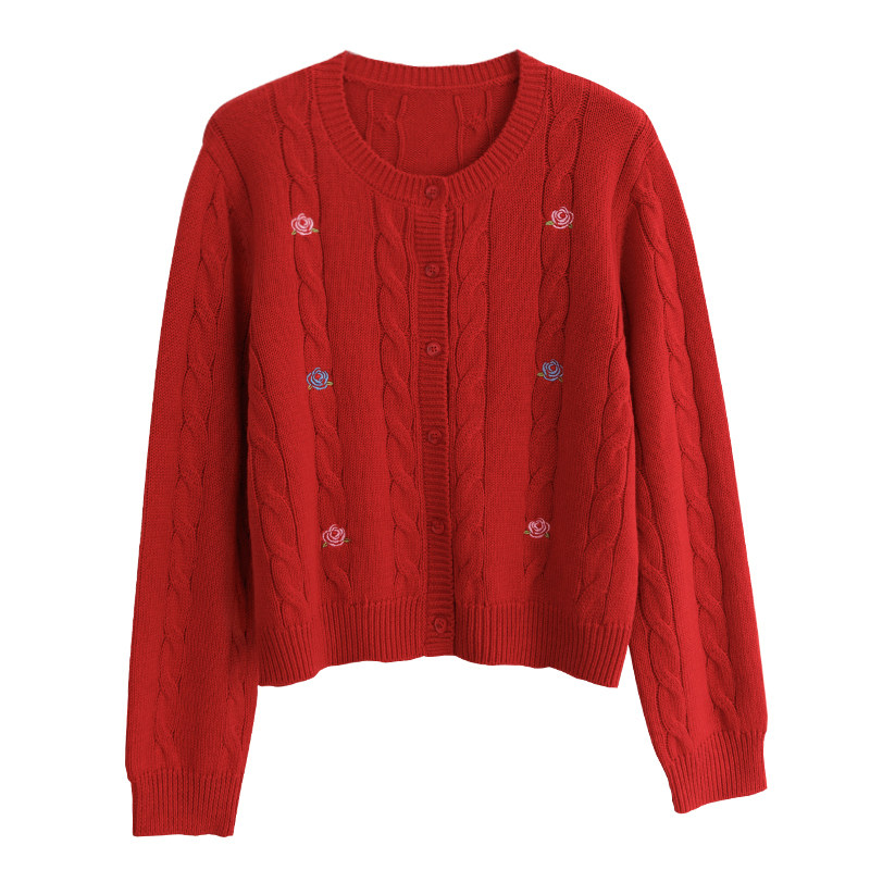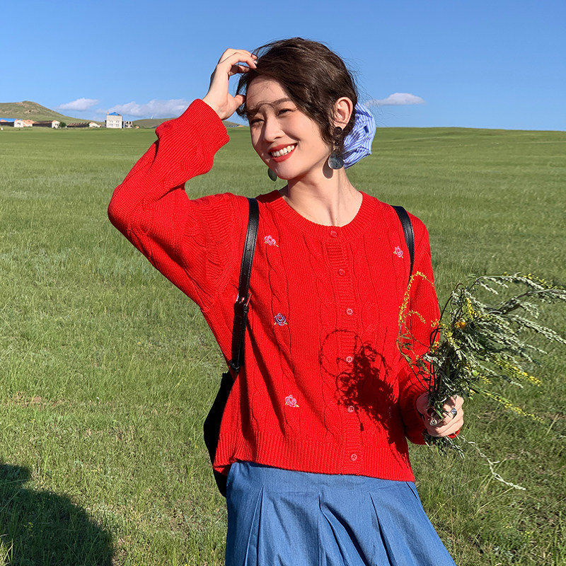 📚 花吉B825红色玫瑰花刺绣针织圆领开衫女2025新款秋宽松毛衣针织衫