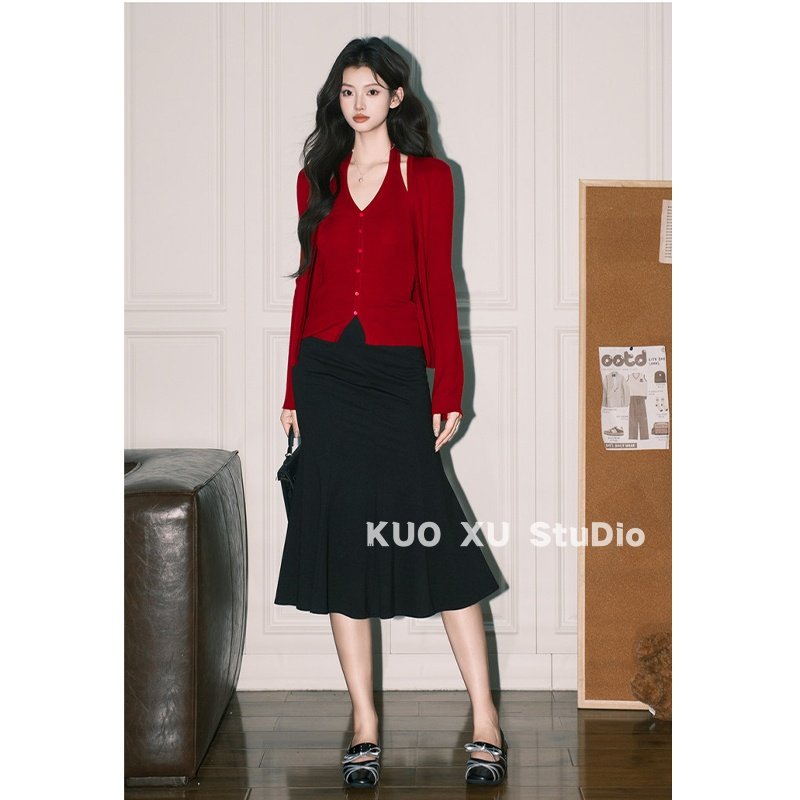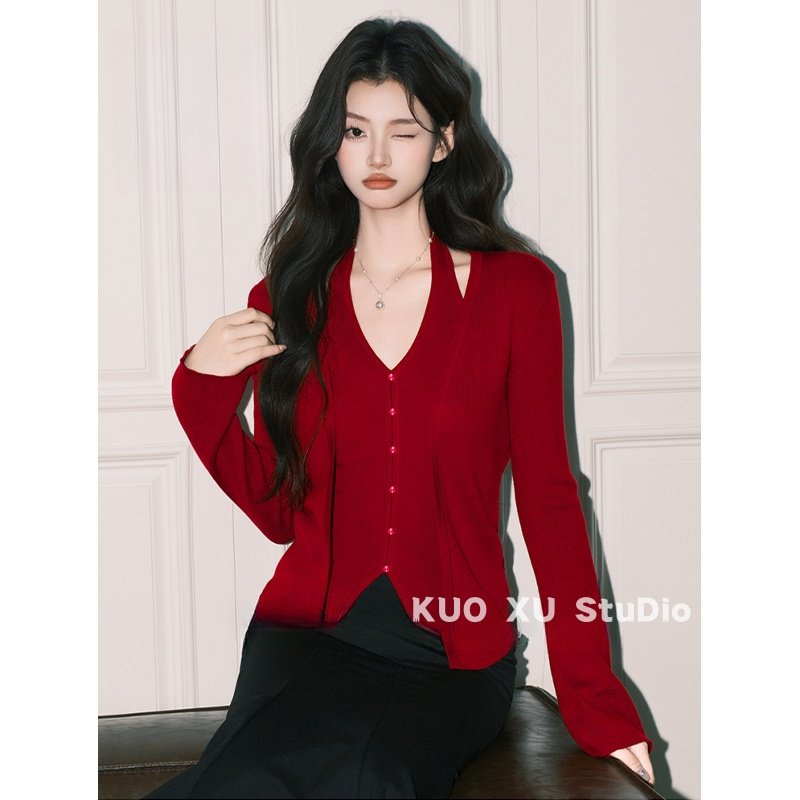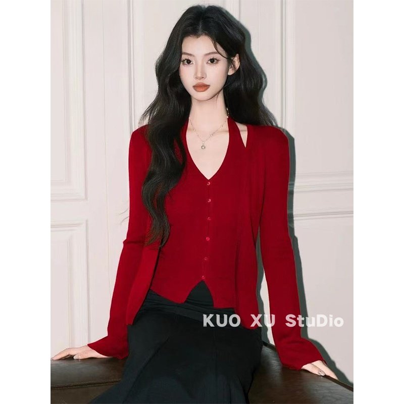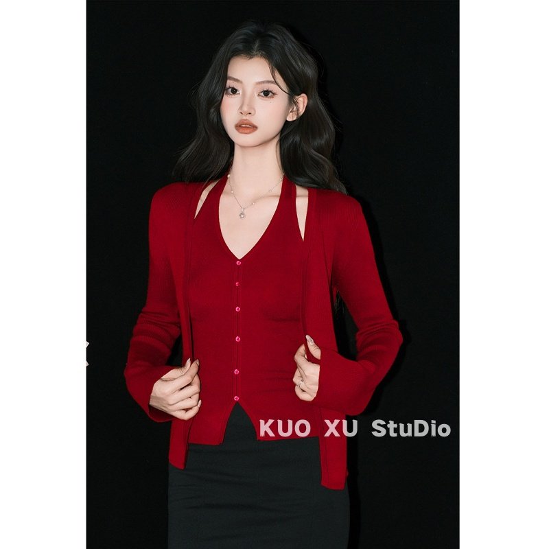 🍁冬日里的温暖秘密,这款【现货秒发】韩式搭配一整套冬装,让我瞬间被吸引!红色挂脖吊带背心叠穿开衫外套,券后价只需149元,简直太划算啦!