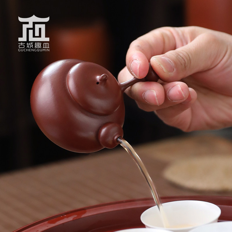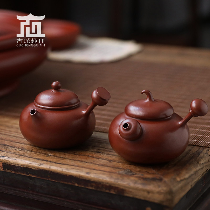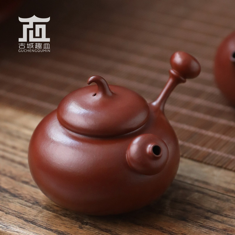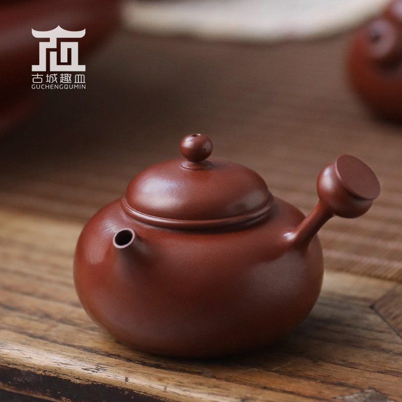 📚 刘金城紫朱泥潮州手拉壶全手工福容福禄侧把泡茶原矿紫砂小品茶壶