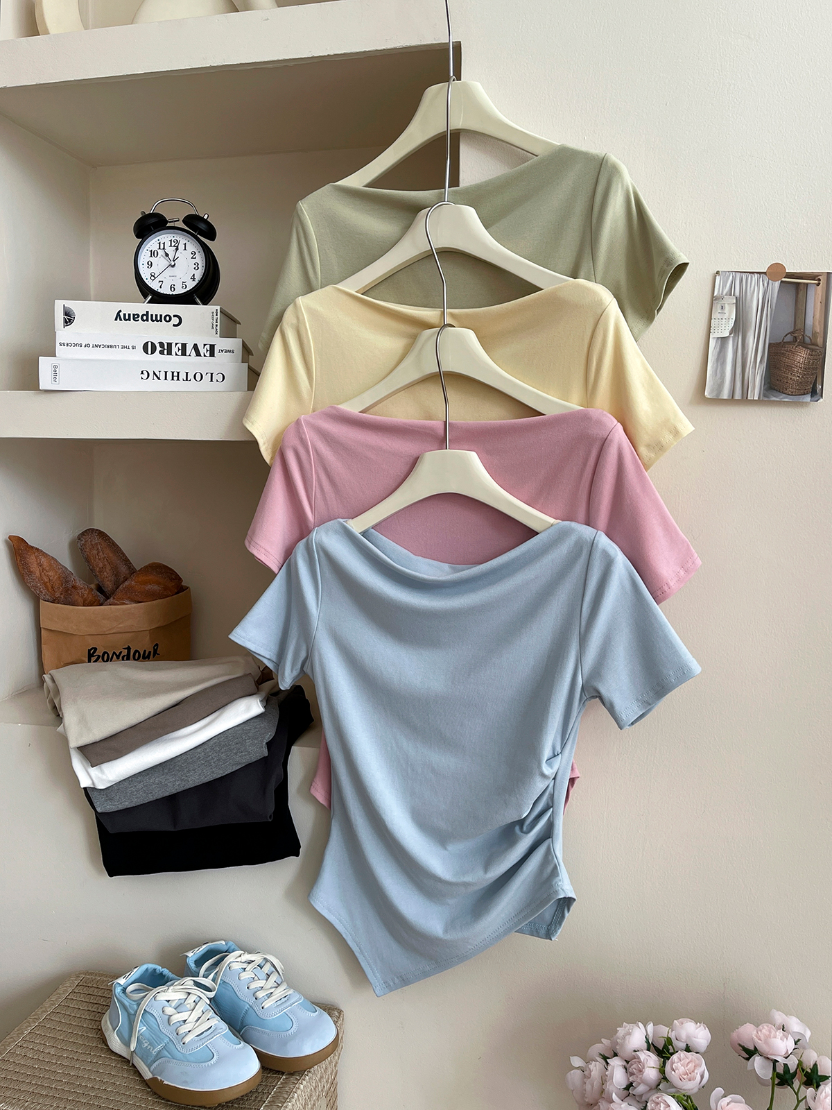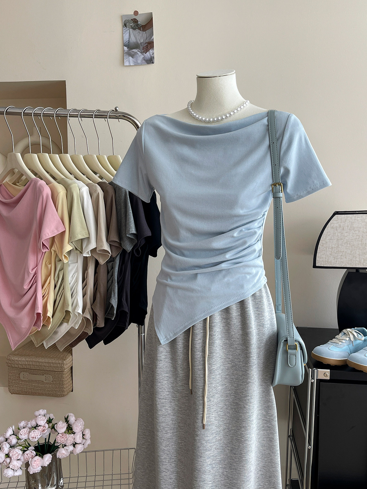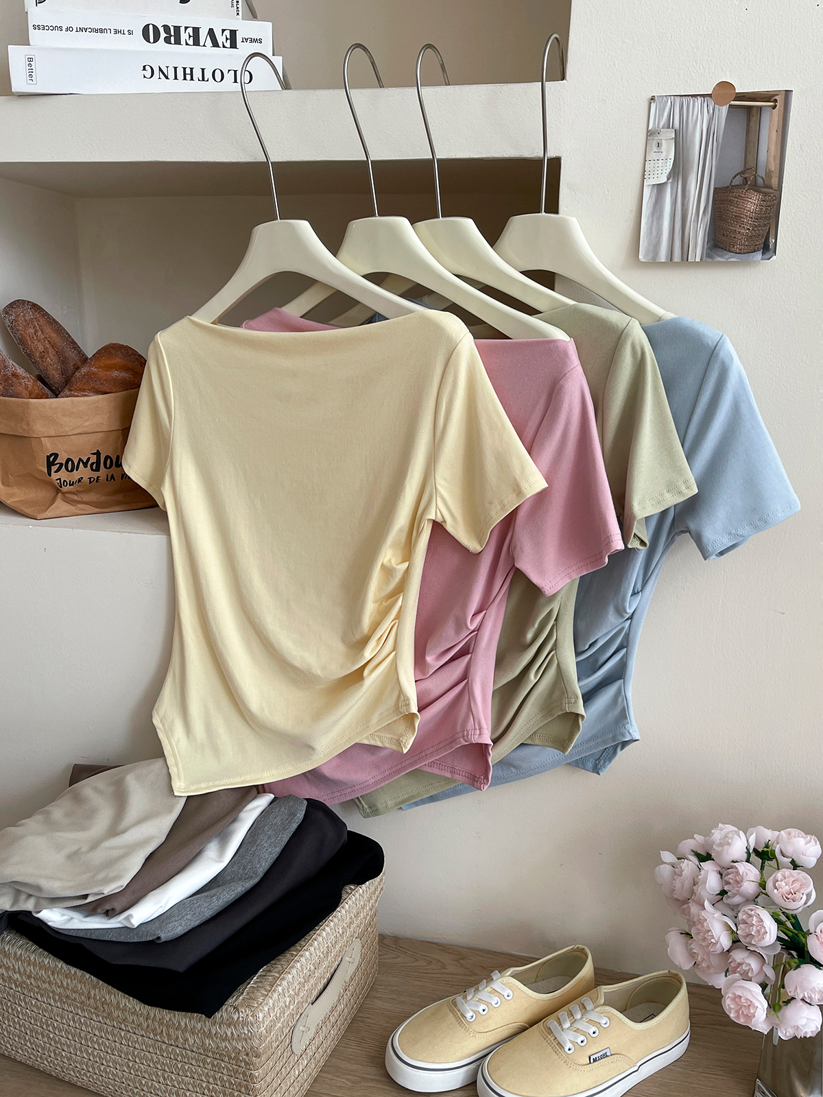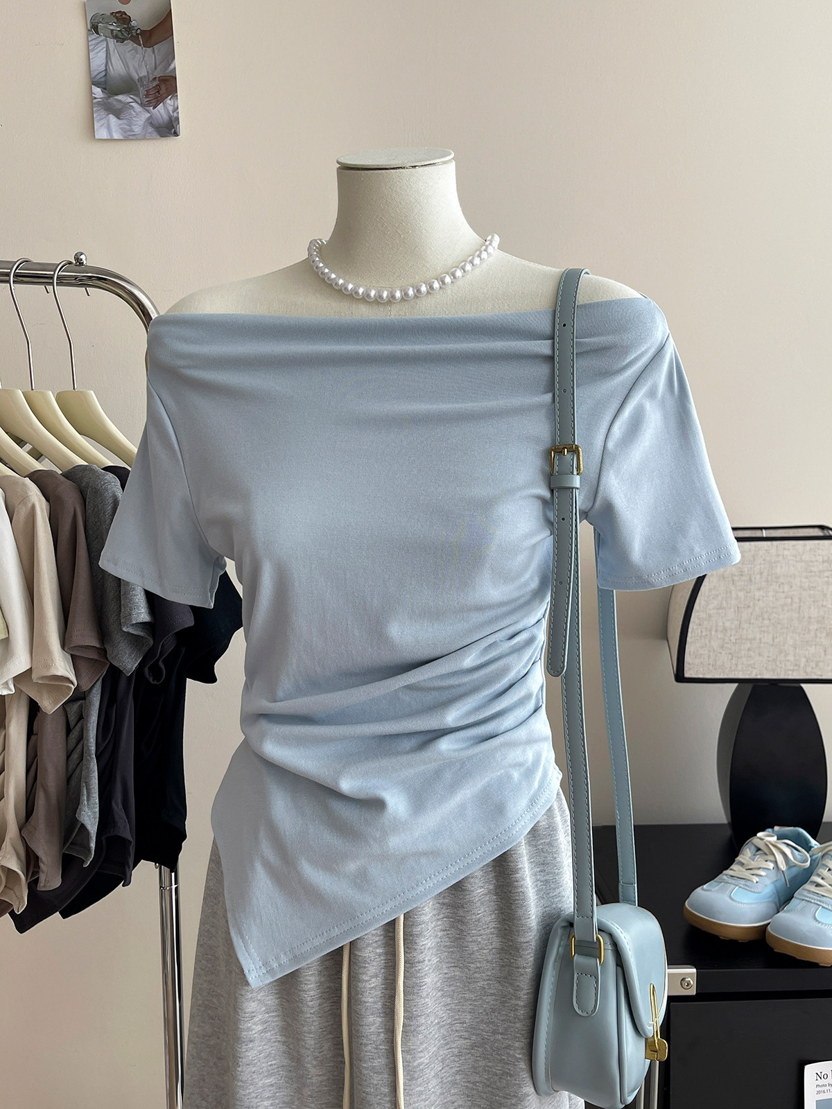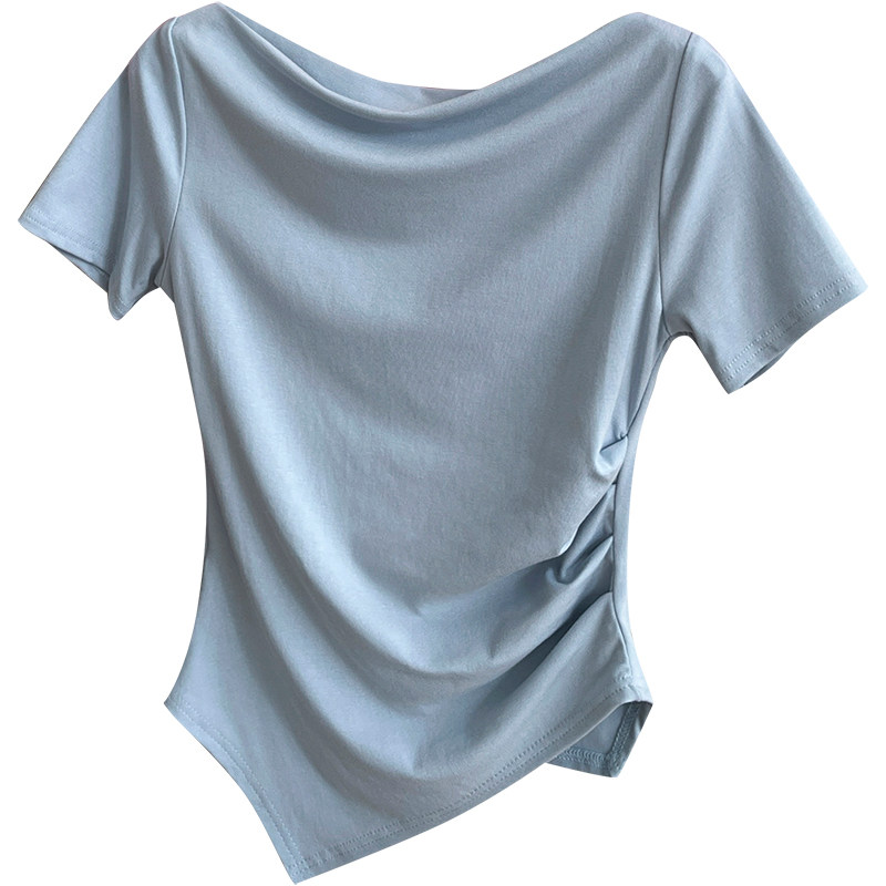 📚 不规则斜边抽褶皱收腰一字肩短袖T恤女夏辣妹纯欲风显瘦百搭上衣