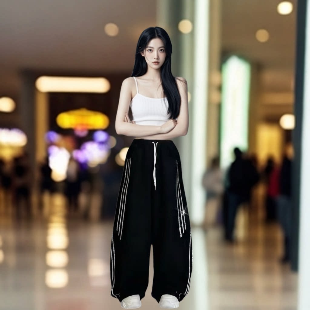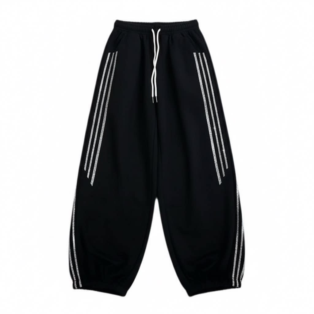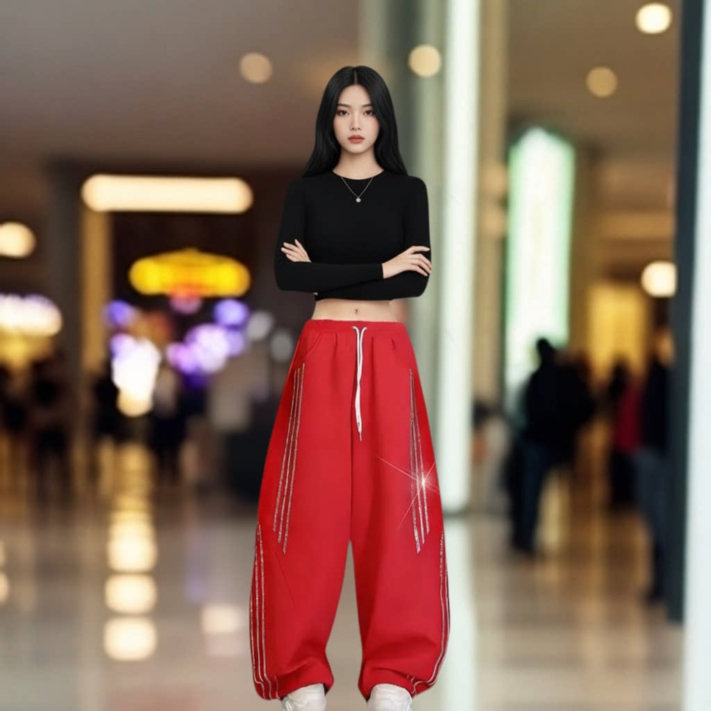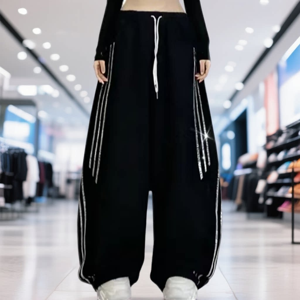 📚 春秋新款烫钻闪钻三条杠广场舞裤子休闲阔腿曳步舞弯刀表演裤宽松