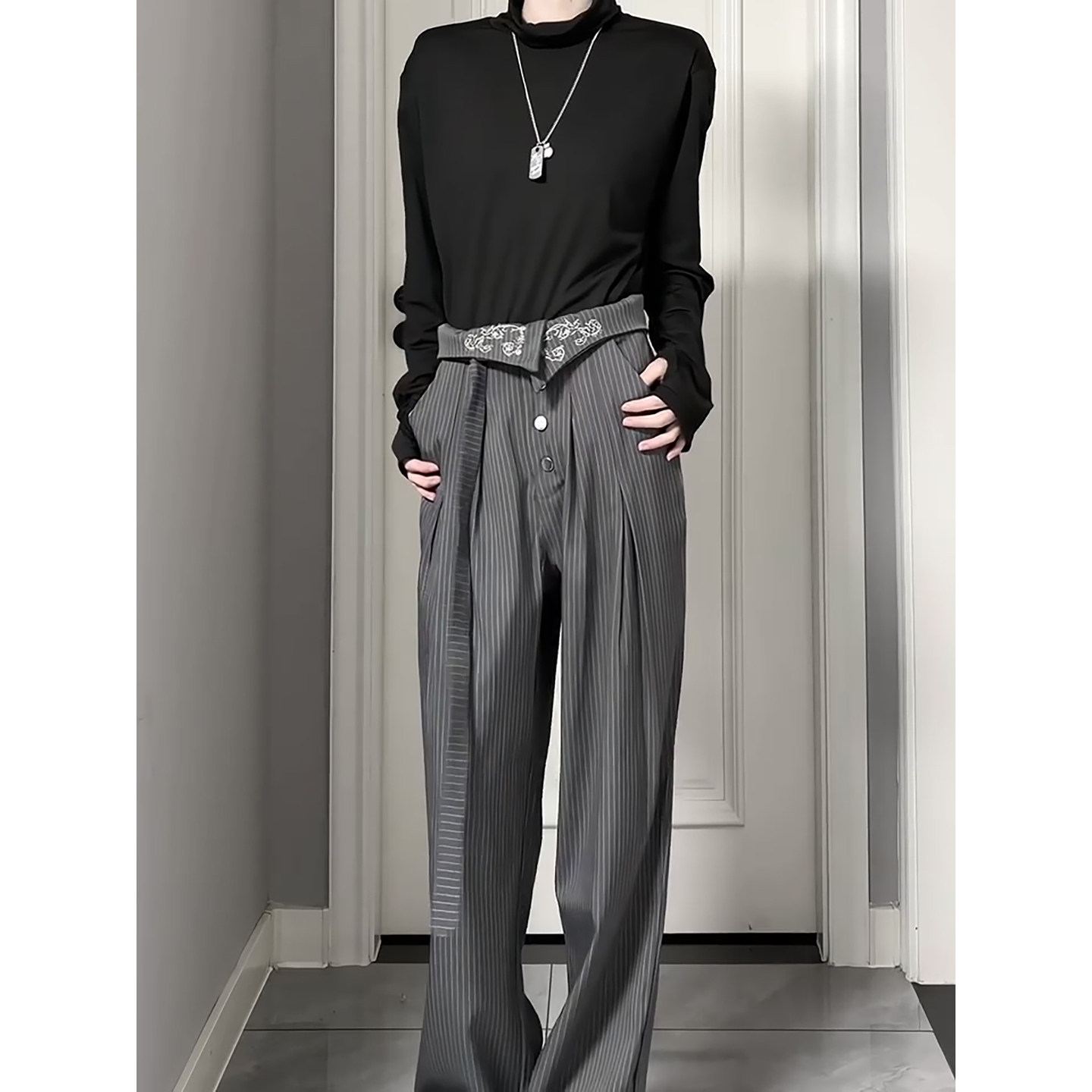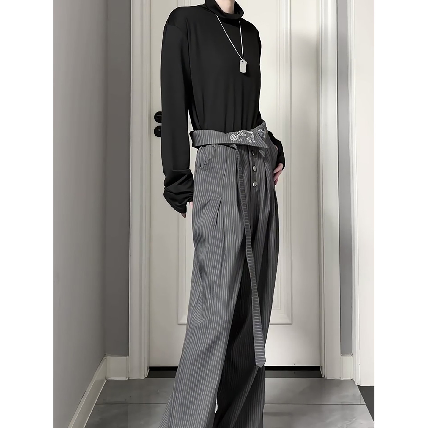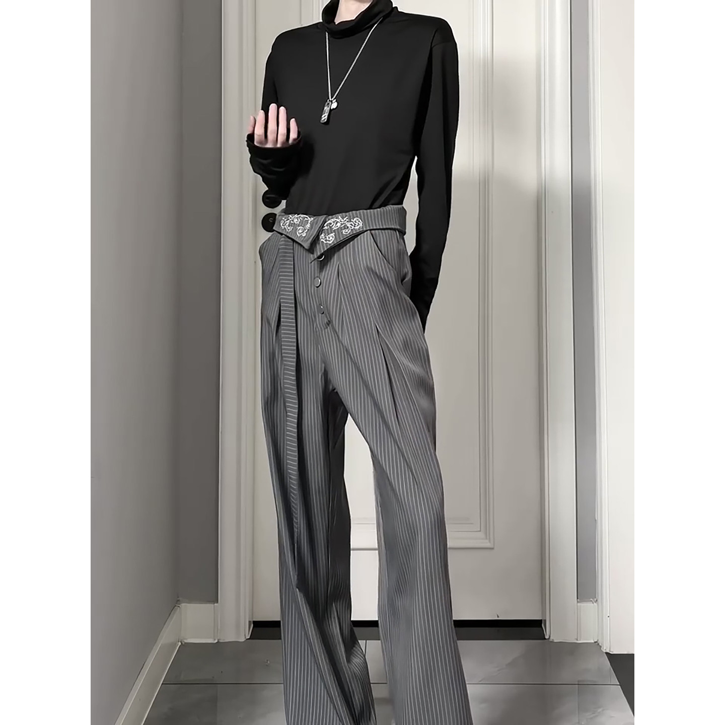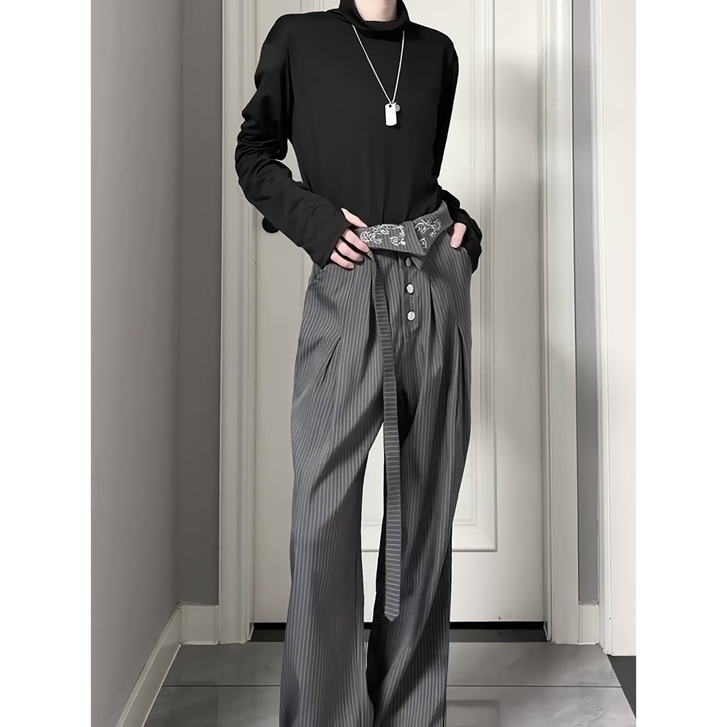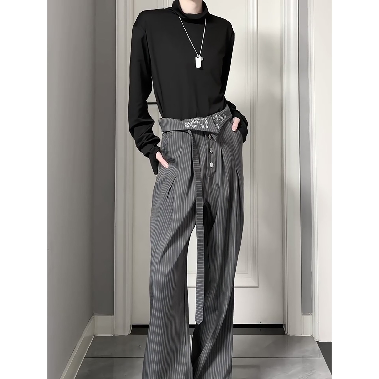 📚 禅宗打褶刺绣微喇西裤加长版高个子男款垂感高腰条纹飘带休闲长裤