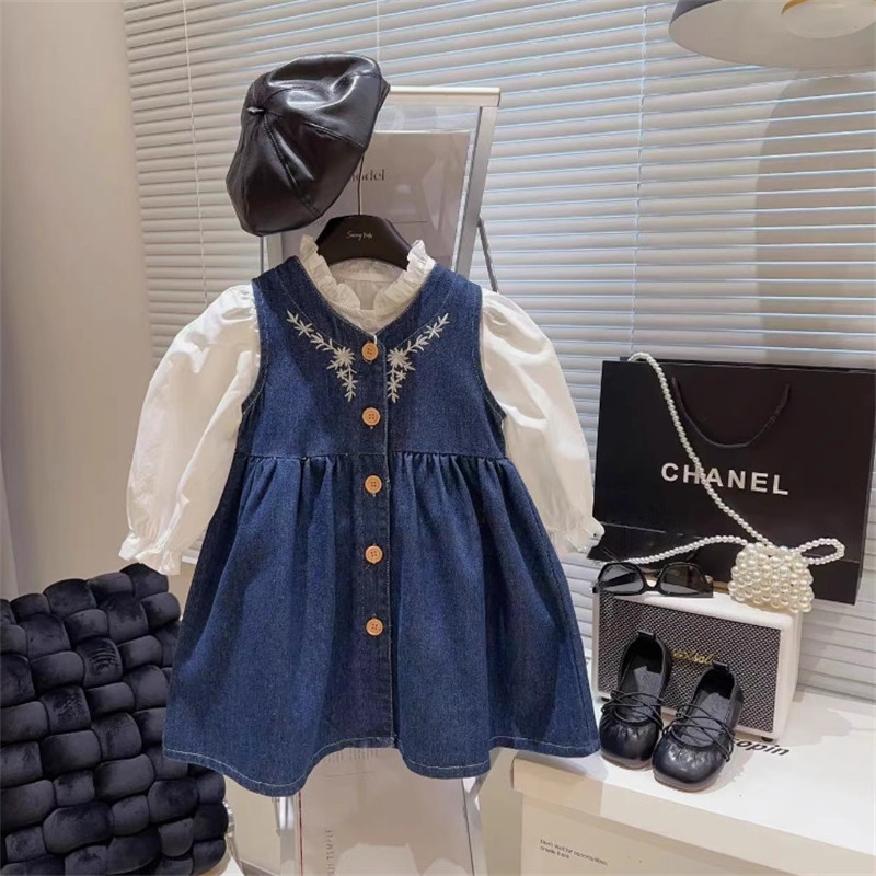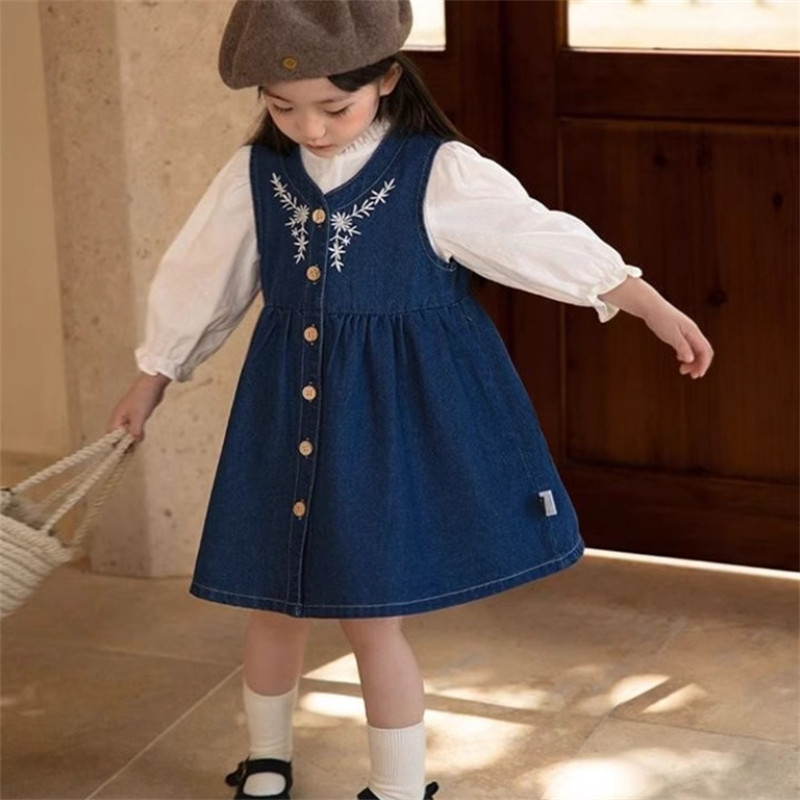 📚 韩国童装2025春季新款女童洋气绣花牛仔裙木耳领休闲衬衫两件套潮