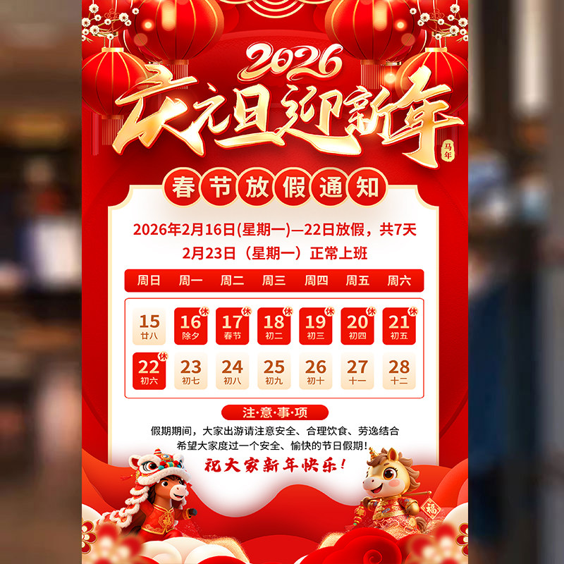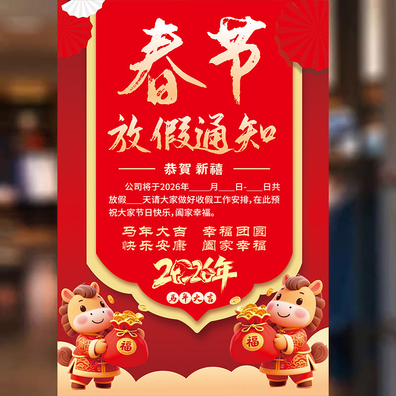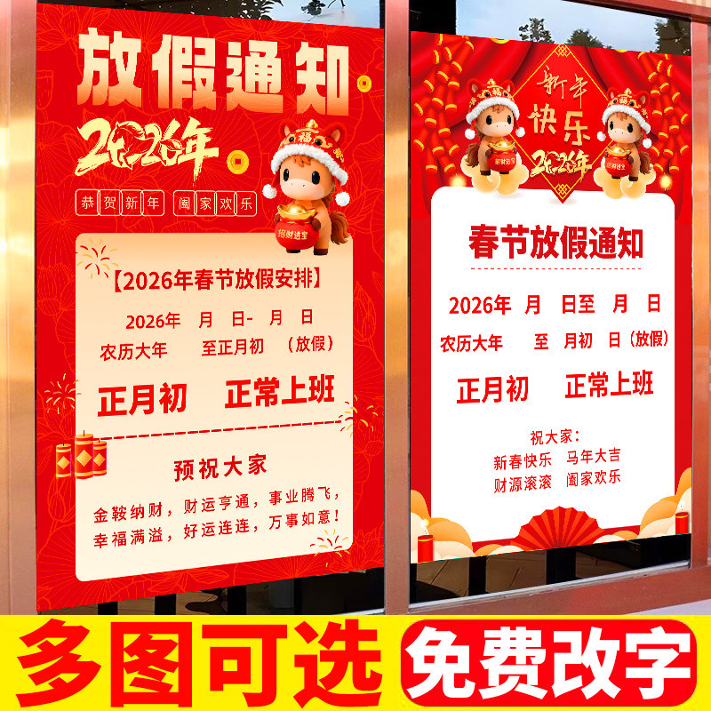 📚 2026马年春节放假通知海报恭贺新春新年服装店商场店铺饭店餐馆过年假期时间公告示广告海报贴定制防水防晒贴