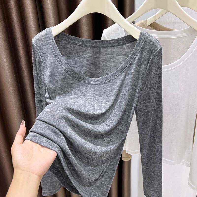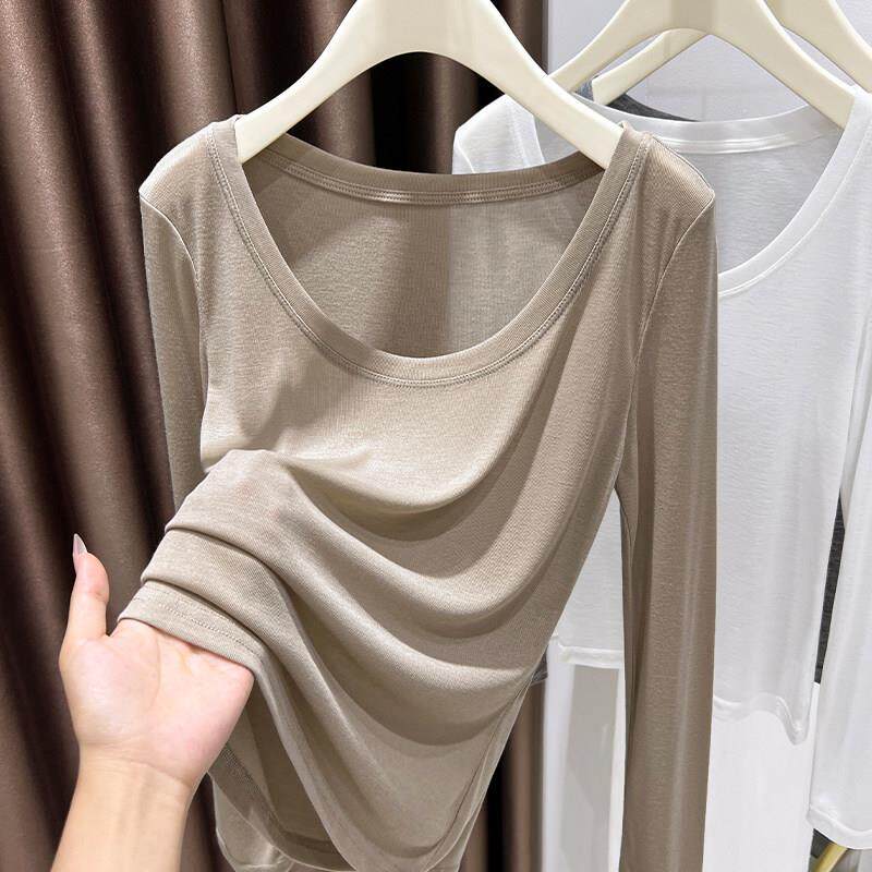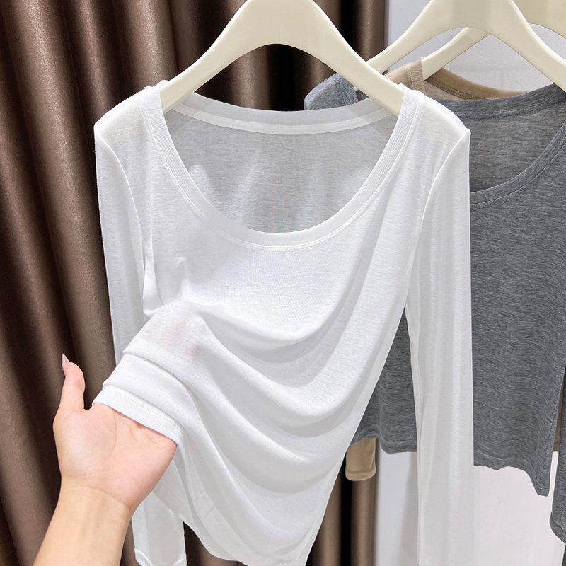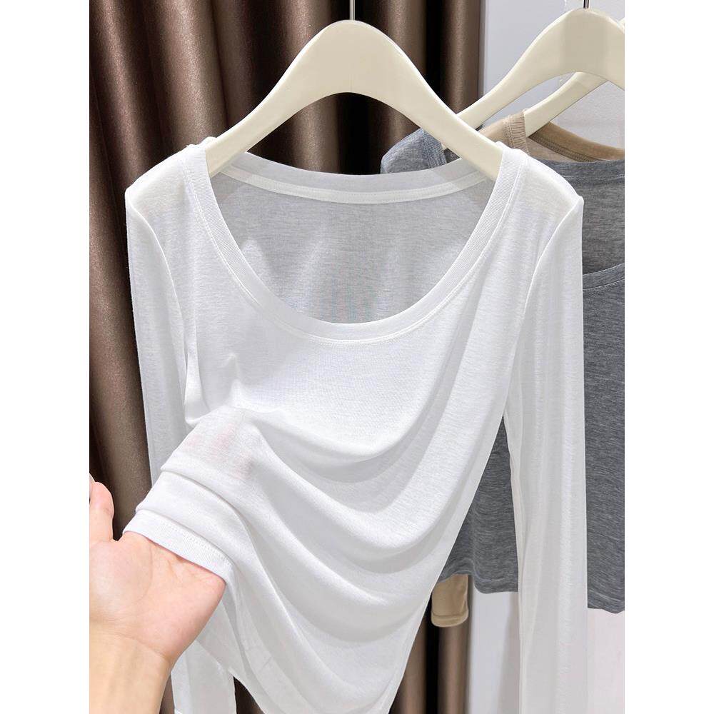 📚 白色薄款针织打底衫女士长袖内搭2026夏季新款大圆领修身t恤0302e