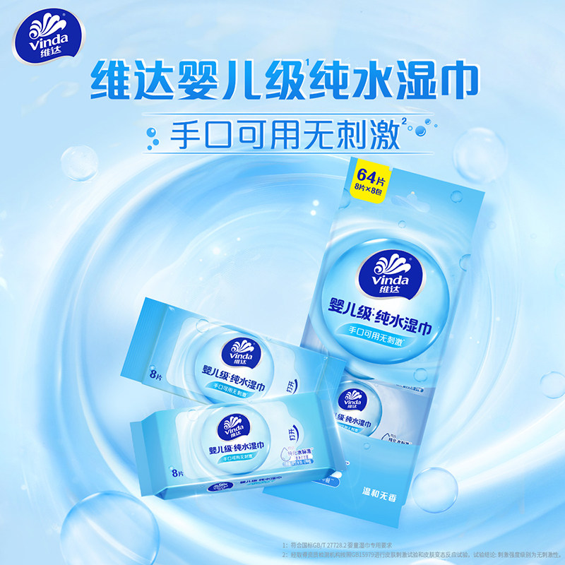 📚 维达维达纯水湿巾64片8小包便携装清洁湿纸巾手口可用湿巾