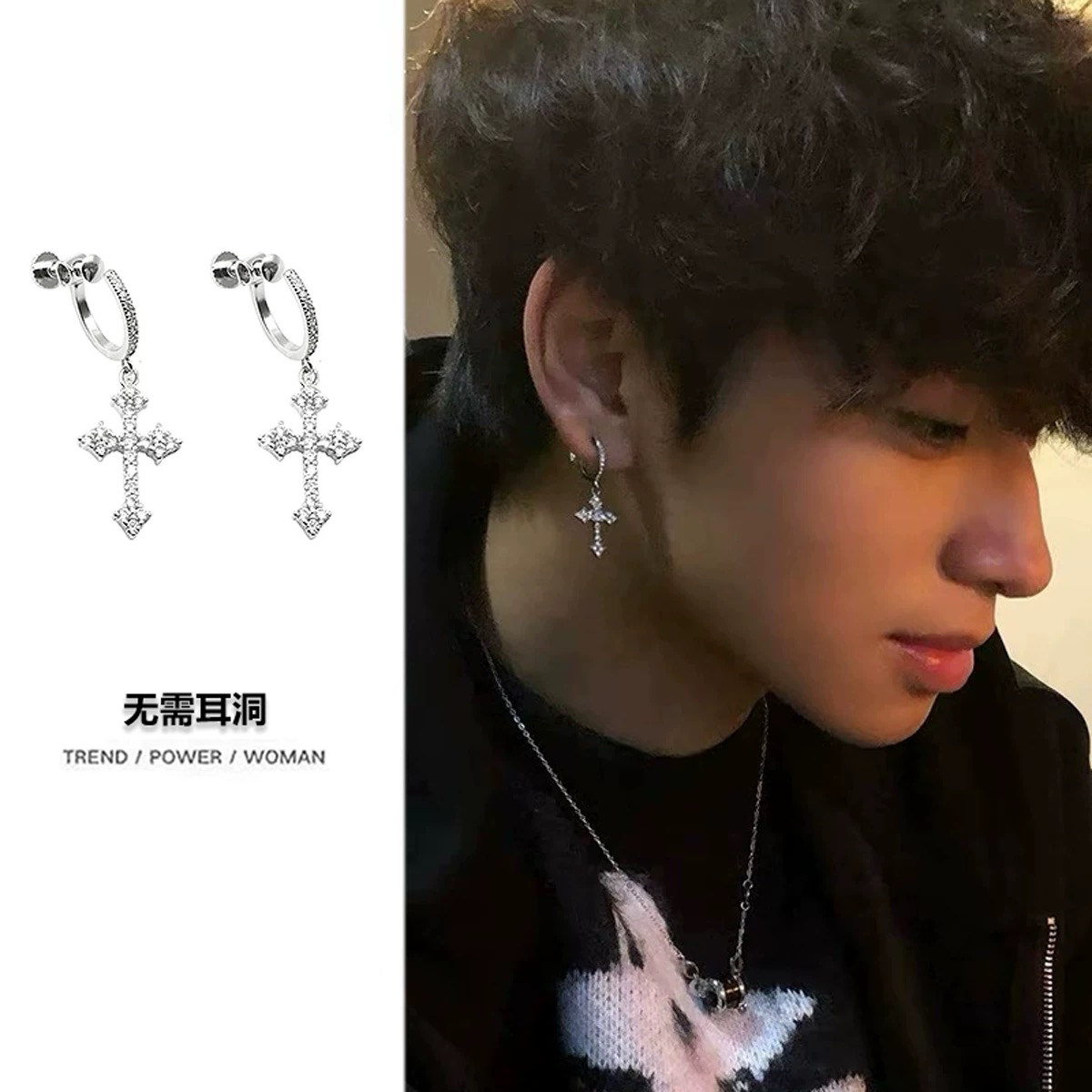 📚 十字架高级感耳夹男无耳洞新款男士耳骨夹小众耳挂式精致闪钻耳环