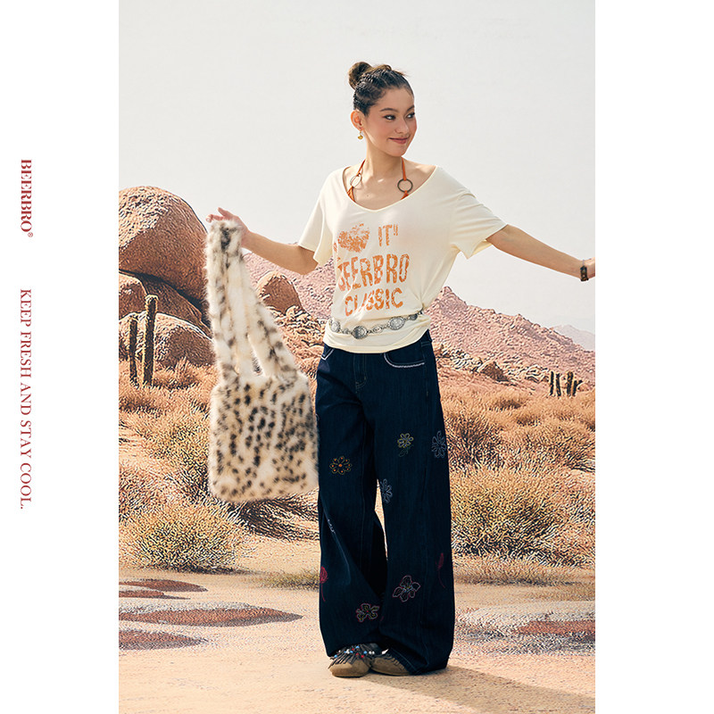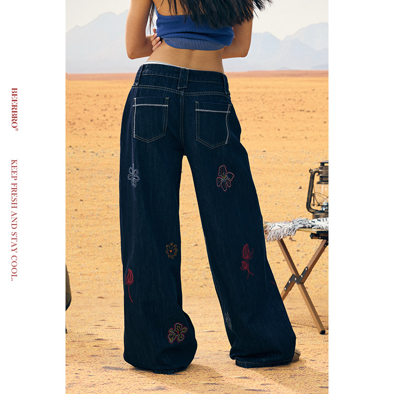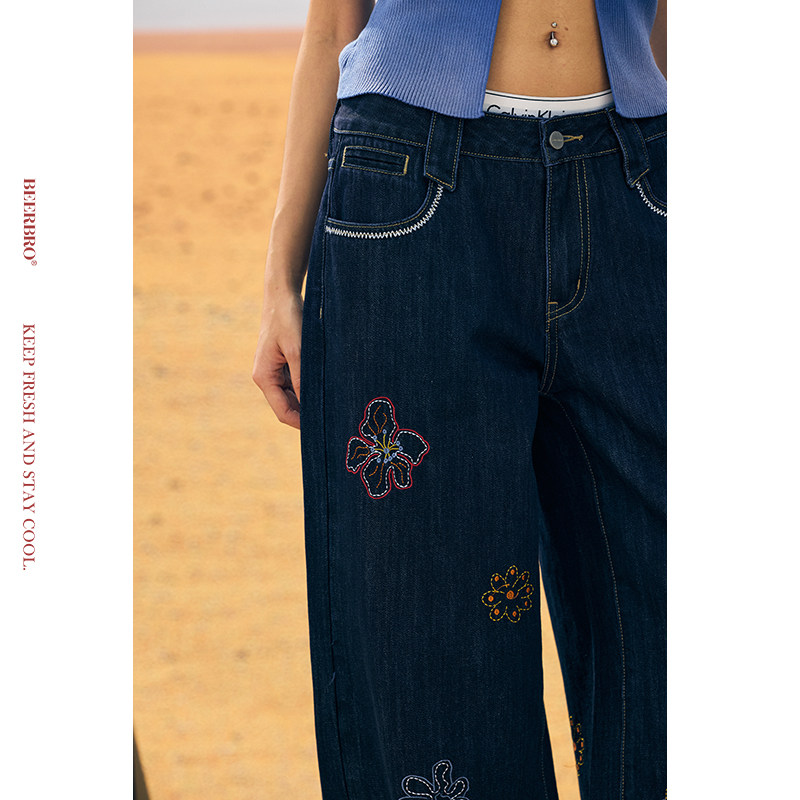 📚 BeerBro『非洲大迁徙』夏日多彩花卉刺绣低腰直筒牛仔裤女夏季