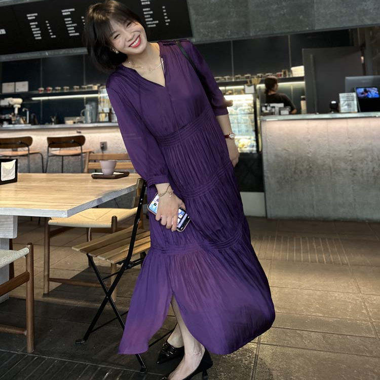 📚 优雅神秘感~精致肌理感打揽设计压褶连衣裙V领显瘦通勤海岛丝长裙