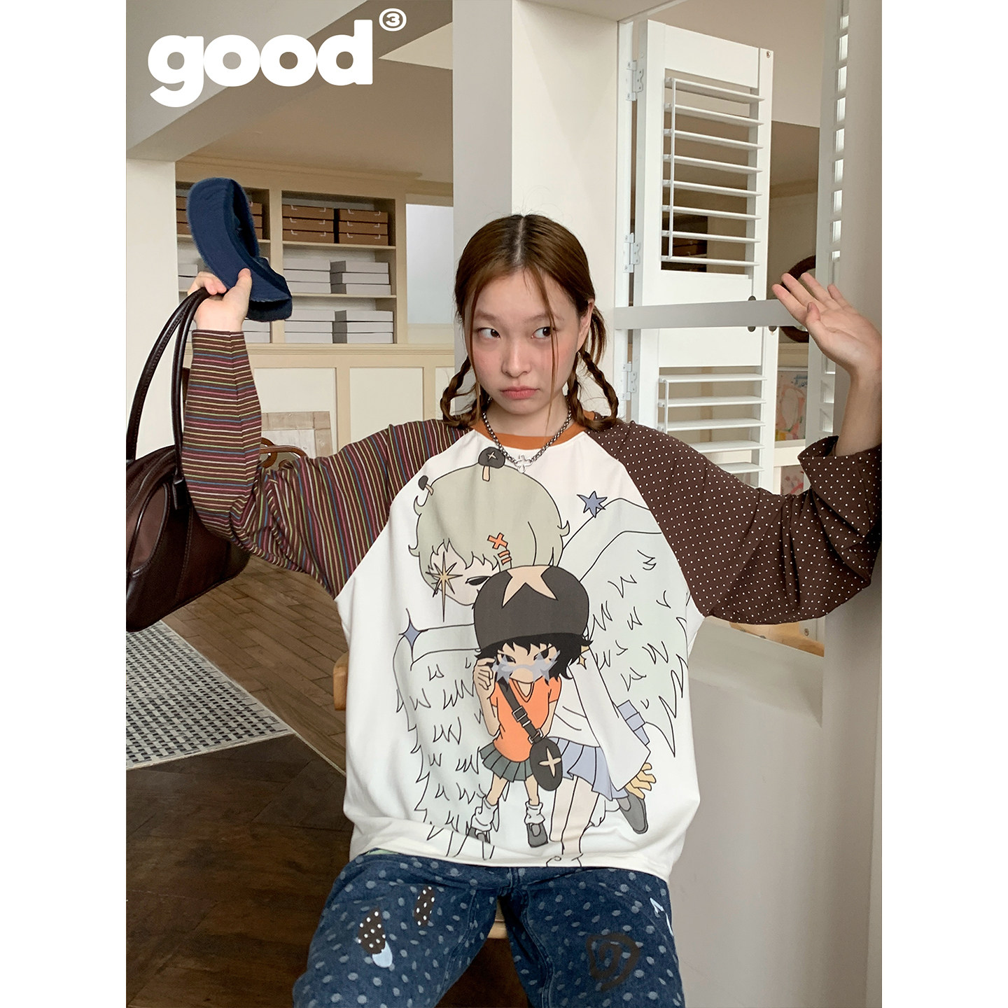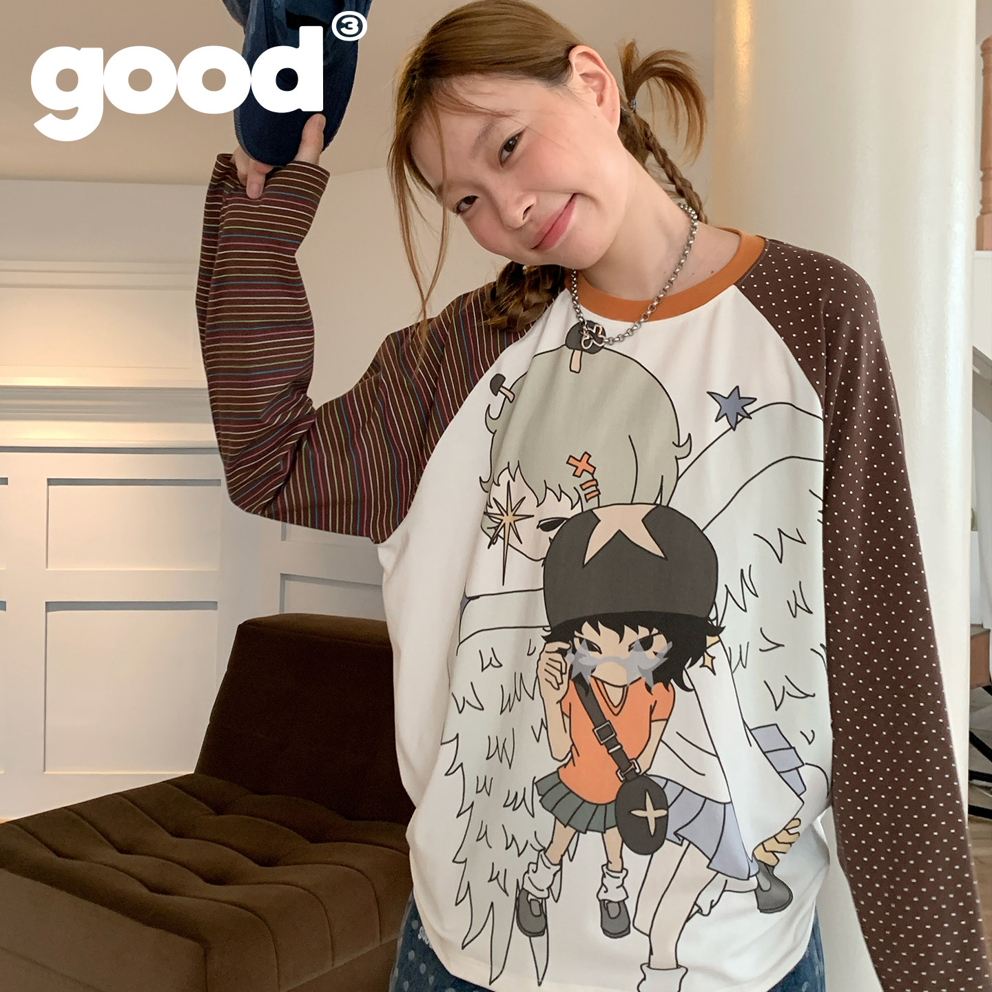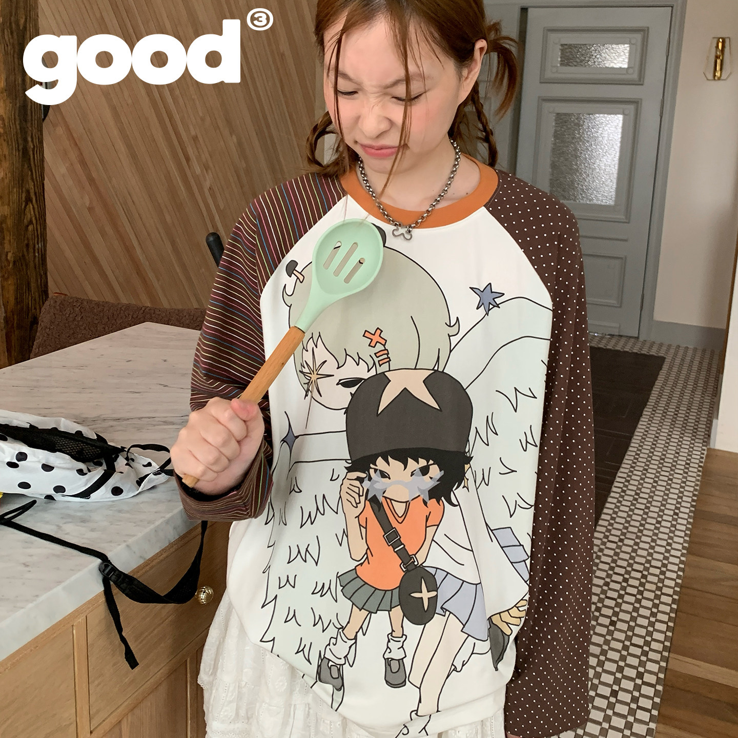 📚 美好商店MeihaoStore「菇天使」手绘亚比女孩条纹波点插肩长袖T恤