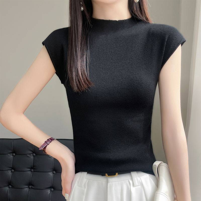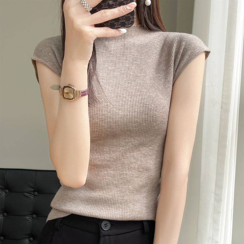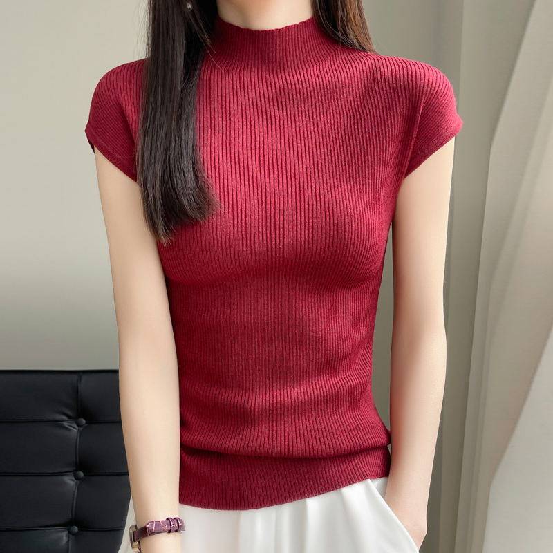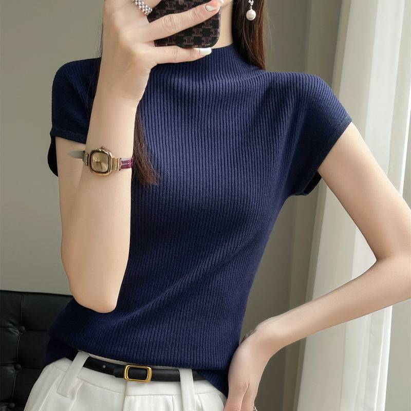 📚 夏季新款半高领精仿羊毛短袖女修身背心简约透气针织T恤包袖上衣