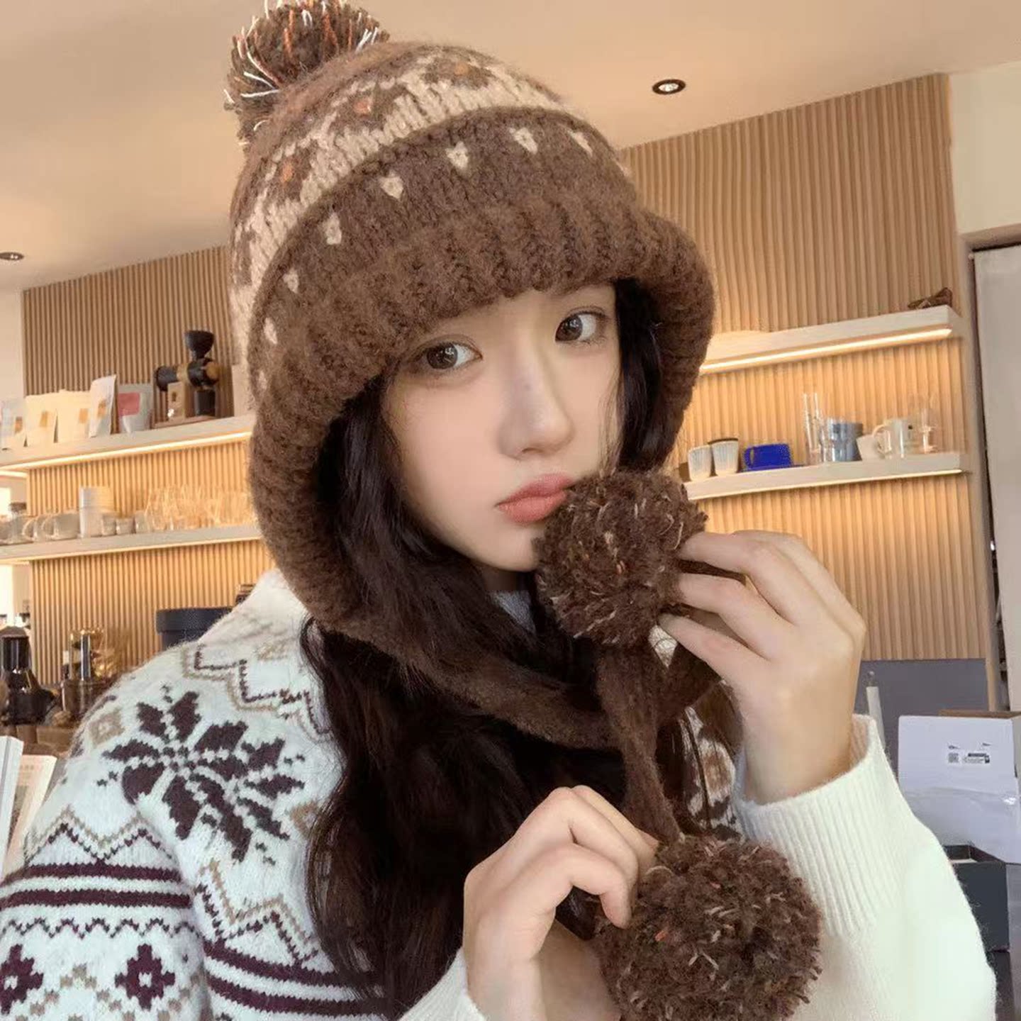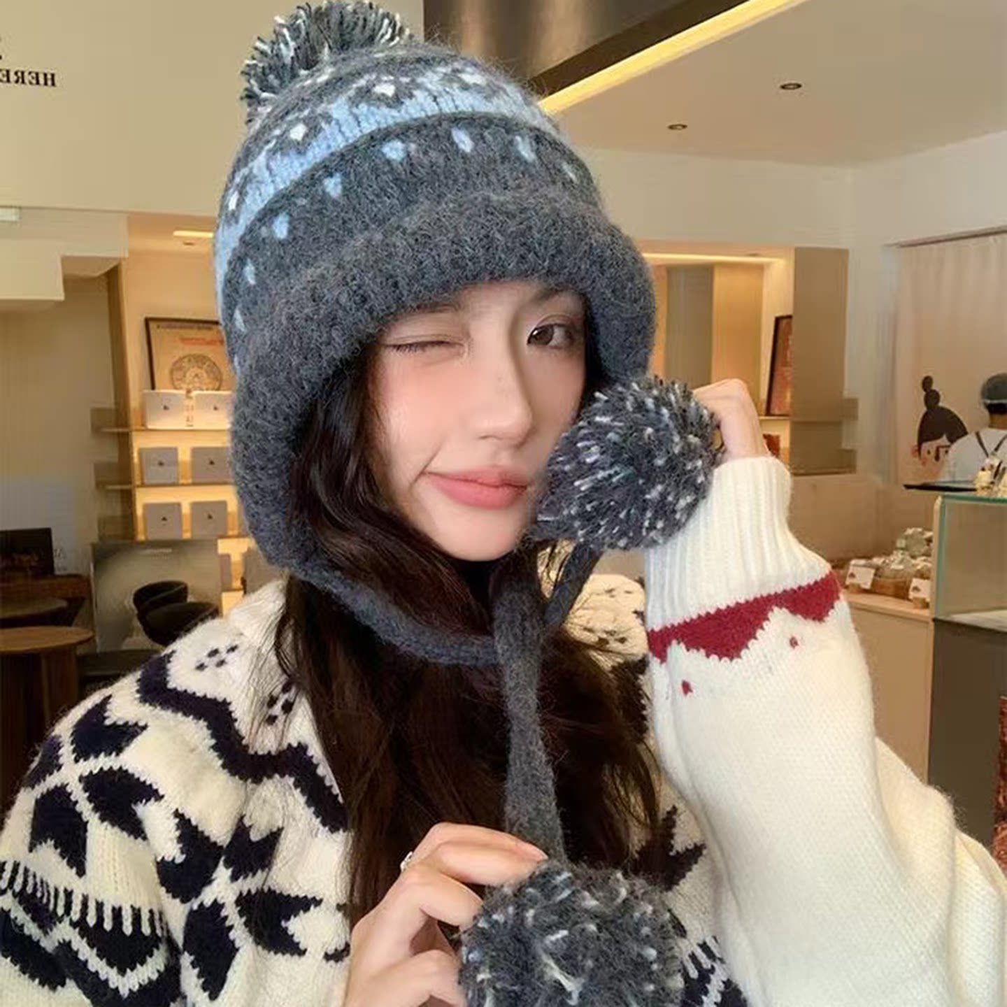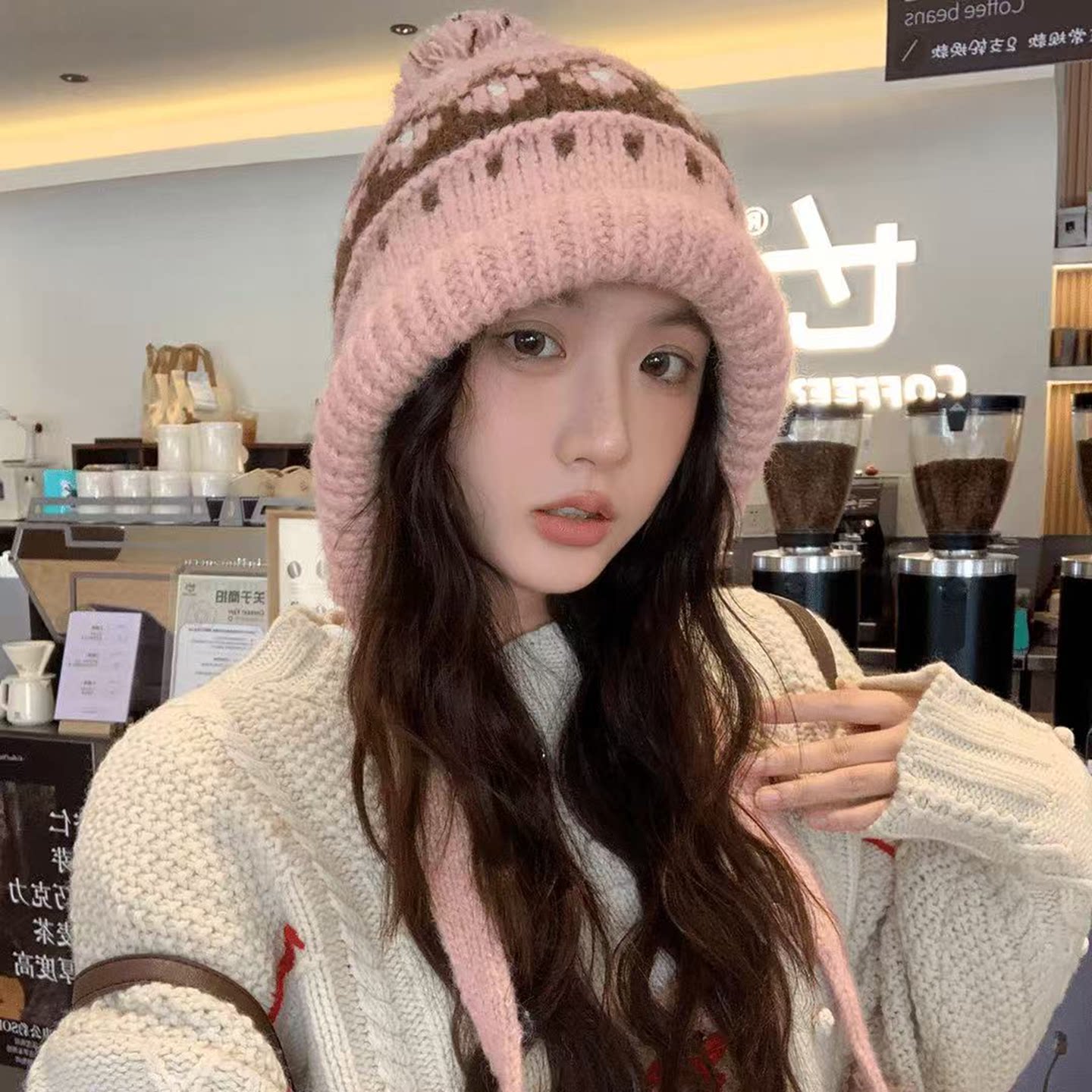📚 红色大头围针织毛线帽子女秋冬复古费尔岛风显脸小保暖护耳雷锋帽