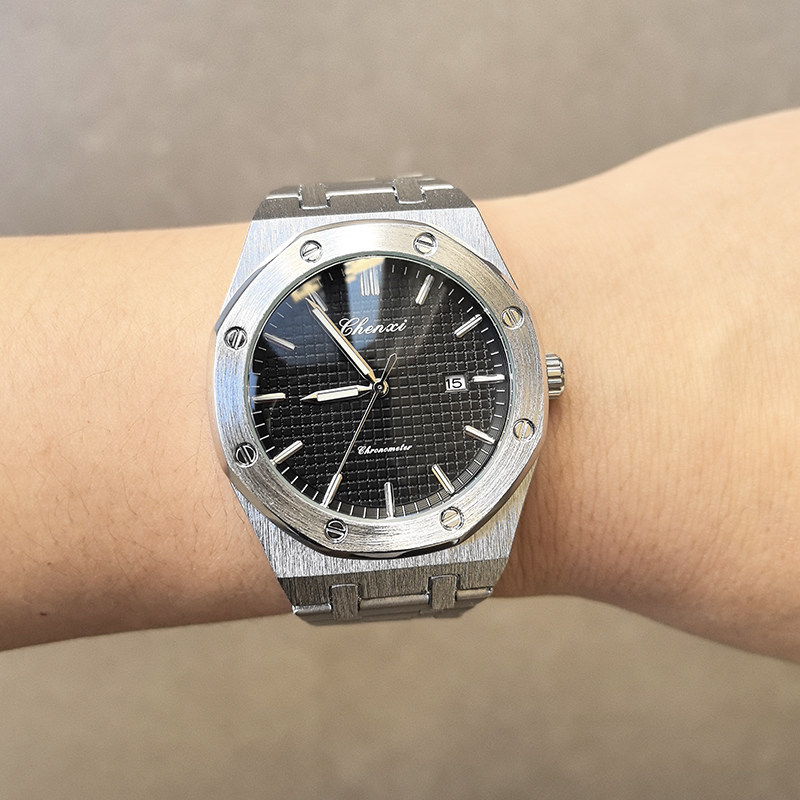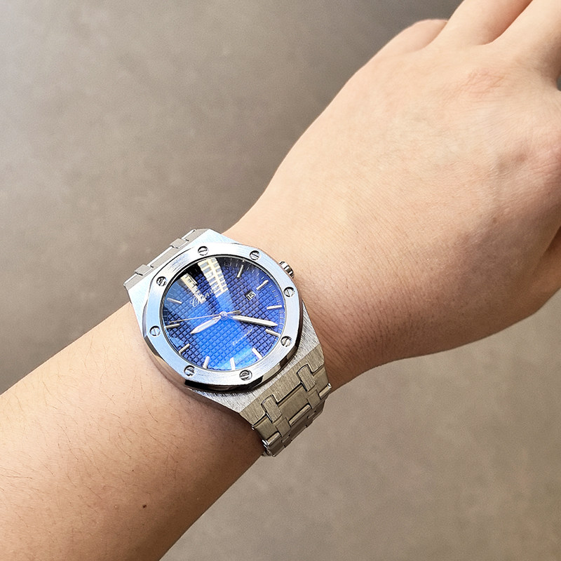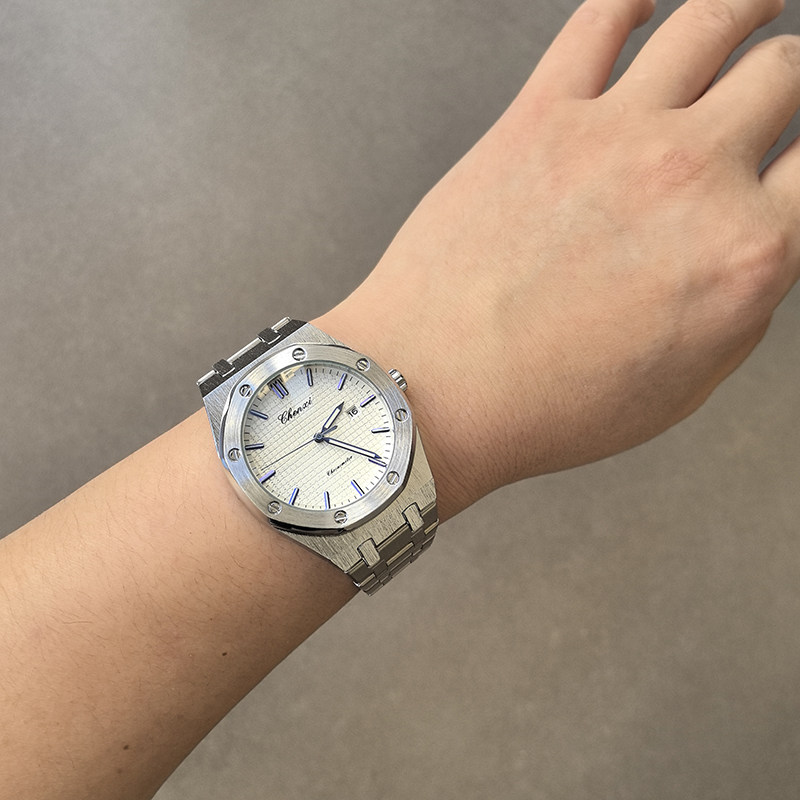 📚 外贸美式超薄橡树八边形夜光日历防水男表石英手表蝴蝶扣拉丝钢带
