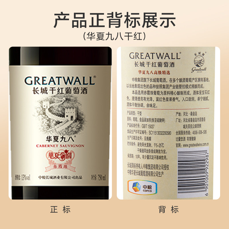 📚 长城干红红酒正品官方旗舰店中粮华夏九八赤霞珠葡萄酒整箱装送礼