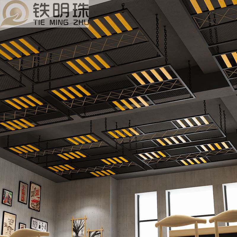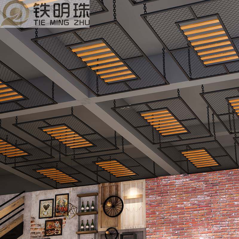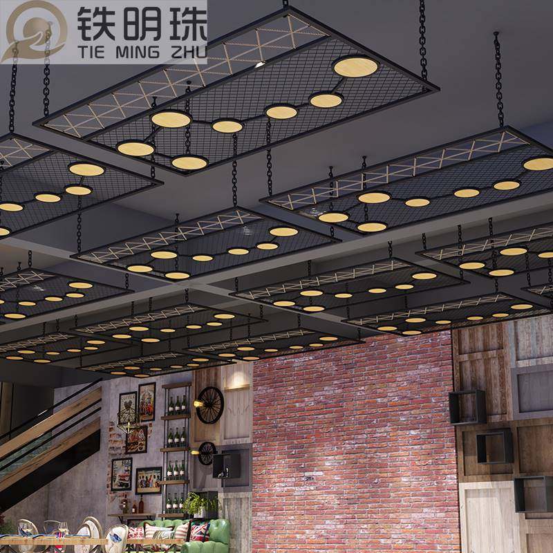 📚 工业风吊顶餐厅铁艺隔断屏风酒店铁网天花板网格麻绳木条装饰定制