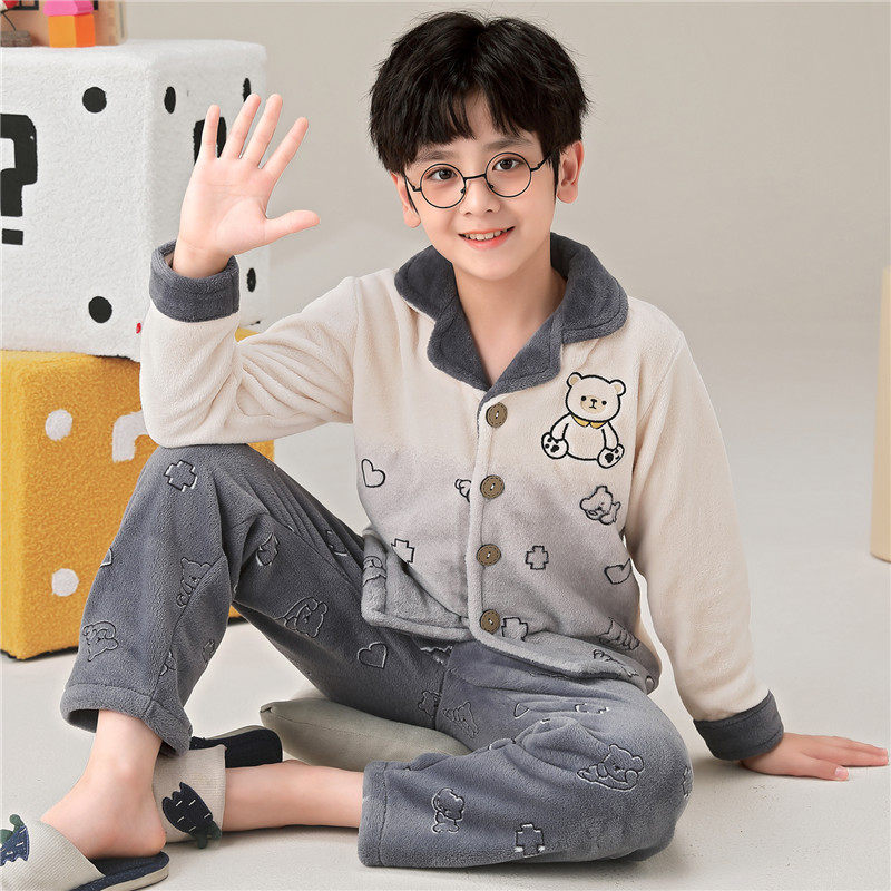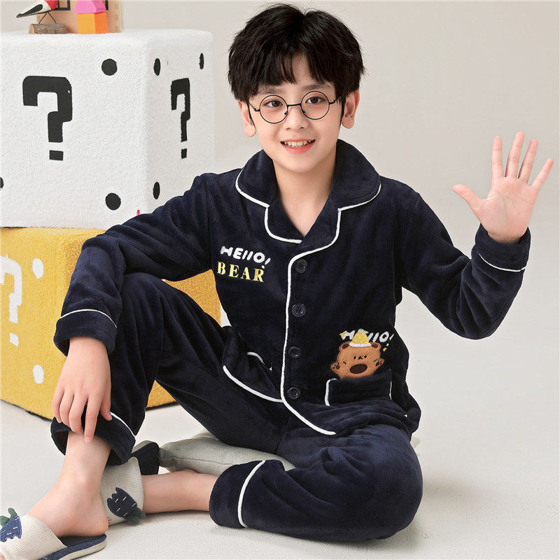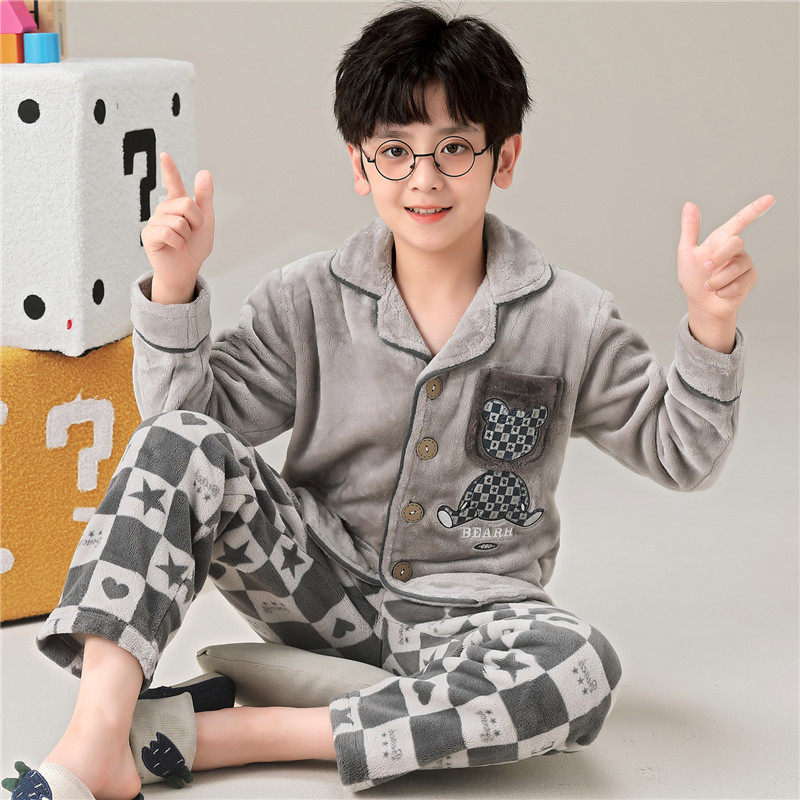 📚 全棉纯棉男童睡衣珊瑚绒秋冬季男孩中大童加厚款小孩儿童家居服