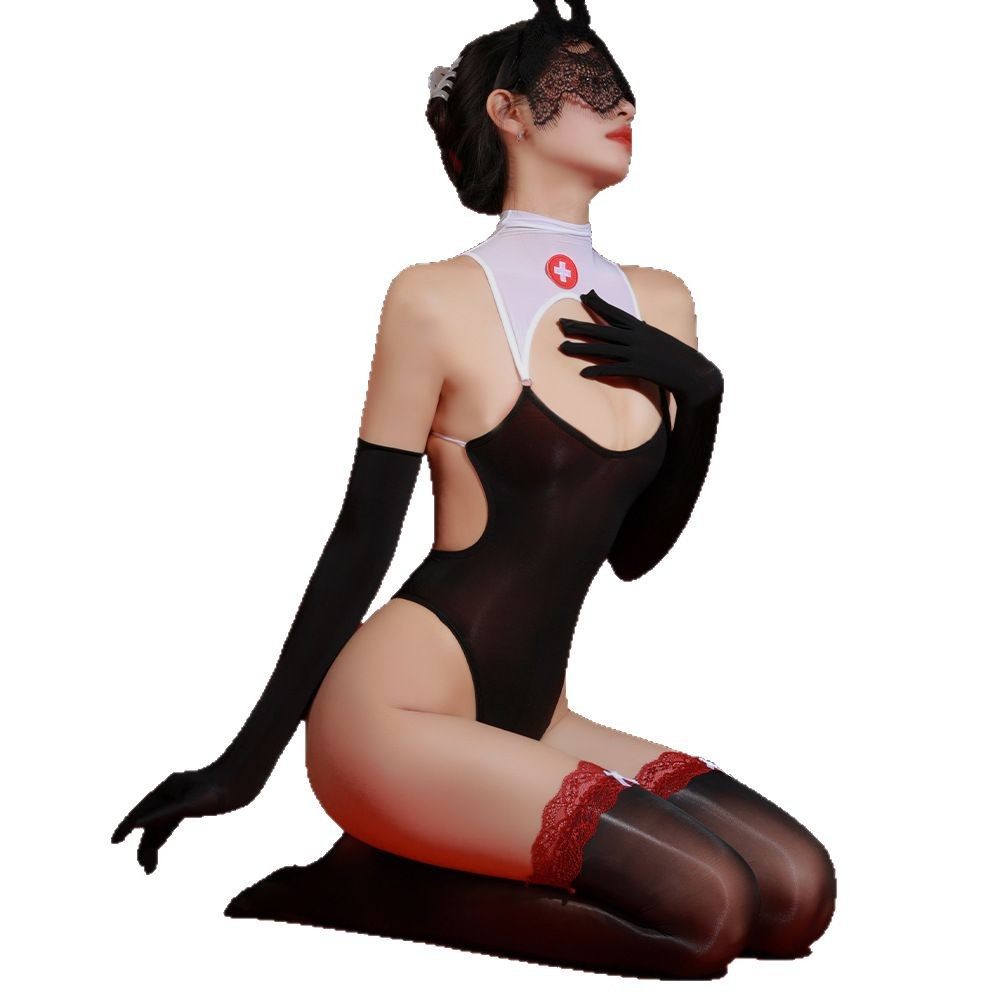 📚 性感油光泳衣连体丝袜套装手套长筒袜油亮丝滑护士服诱惑情调睡衣