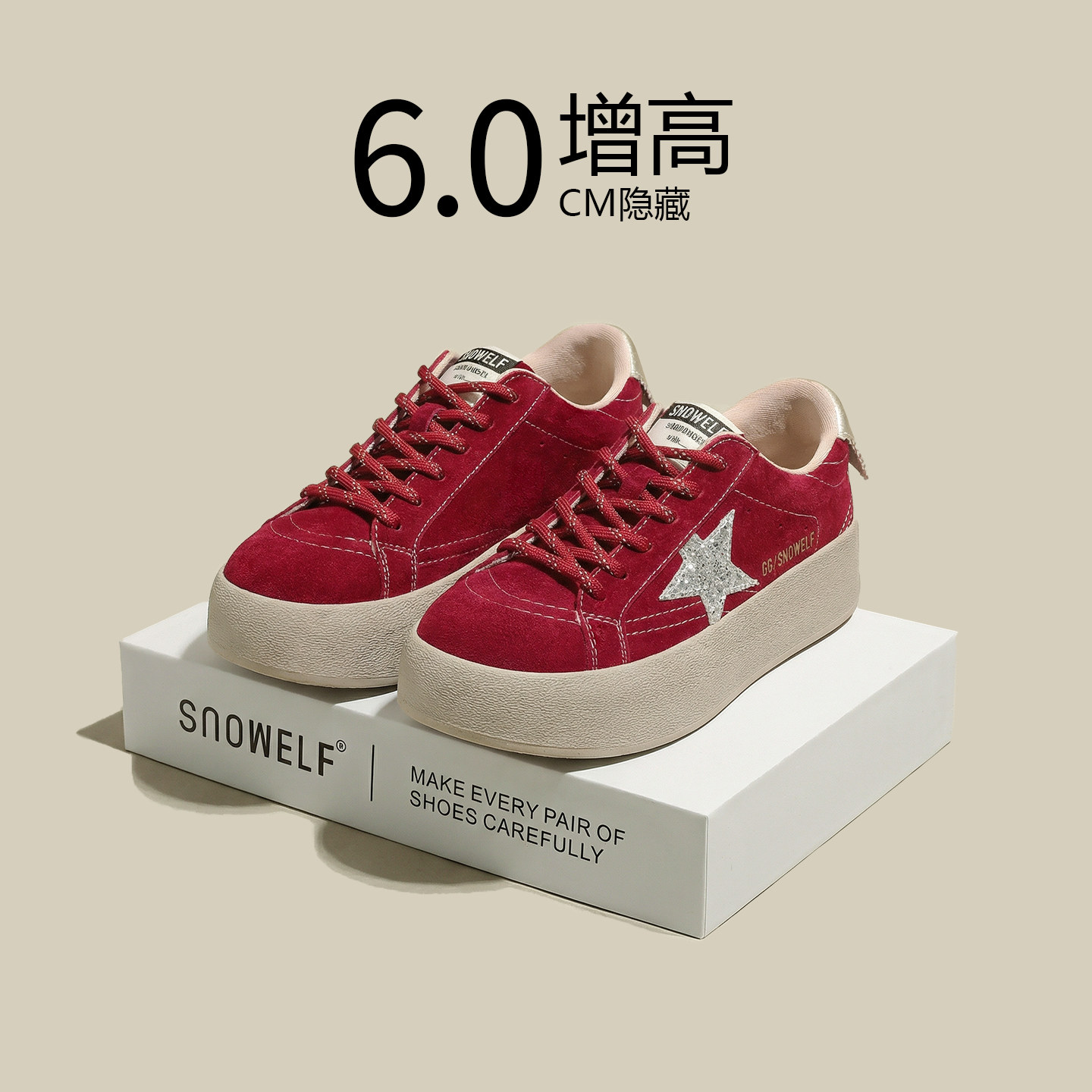 📚 本命年战靴~红色厚底板鞋女2026新款春季真皮百搭内增高星星鞋子