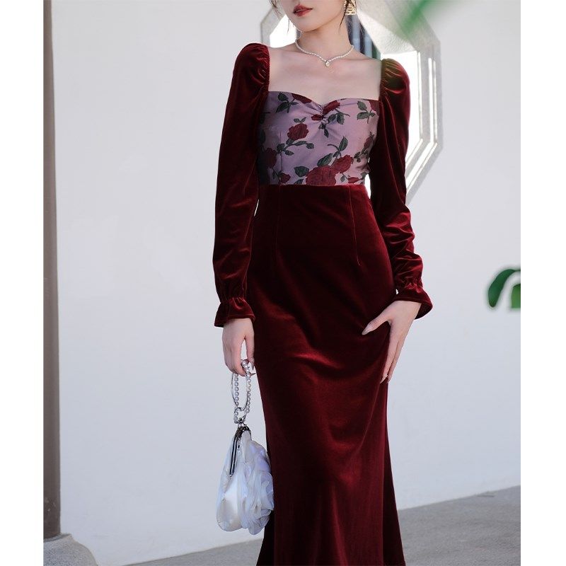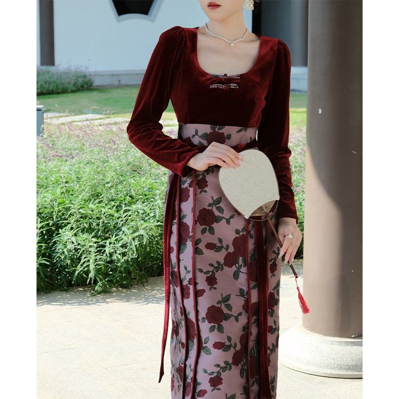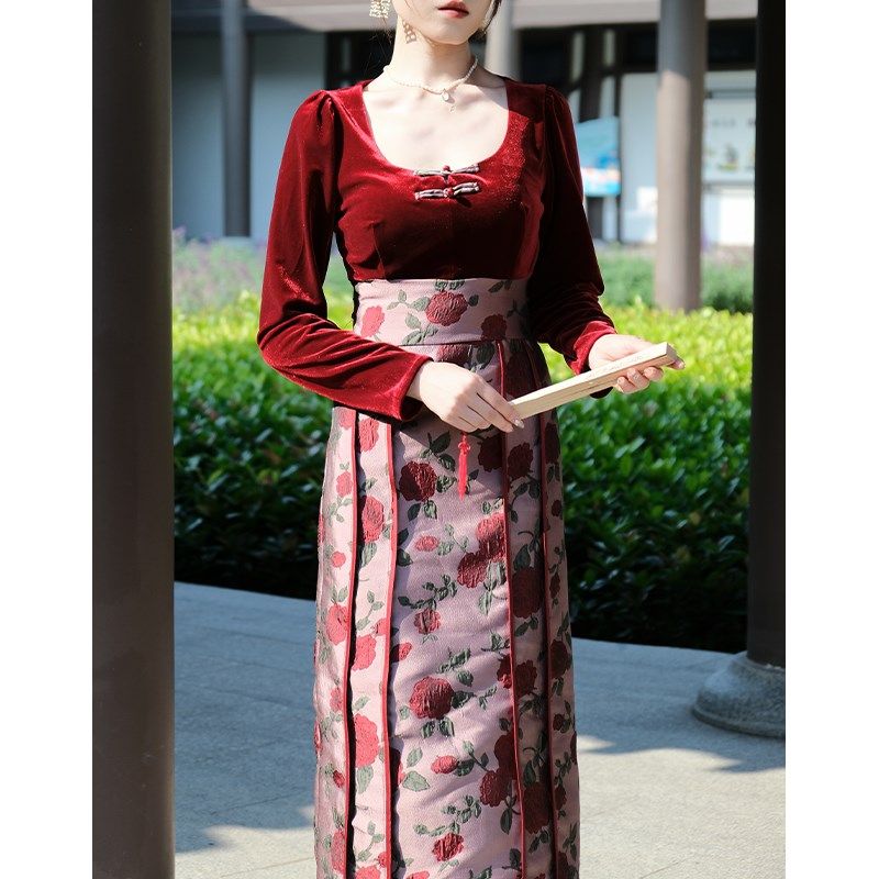 📚 鹿与玫瑰新中式国风改良马面裙女装气质红色丝绒连衣裙订婚礼服裙