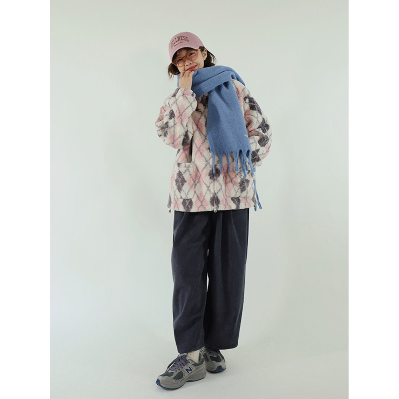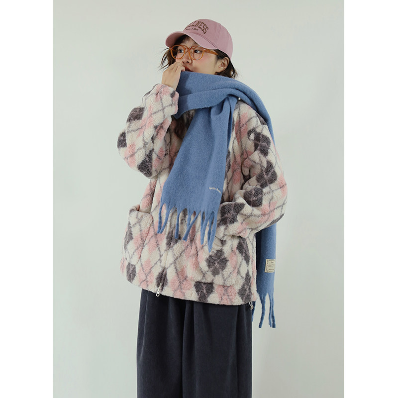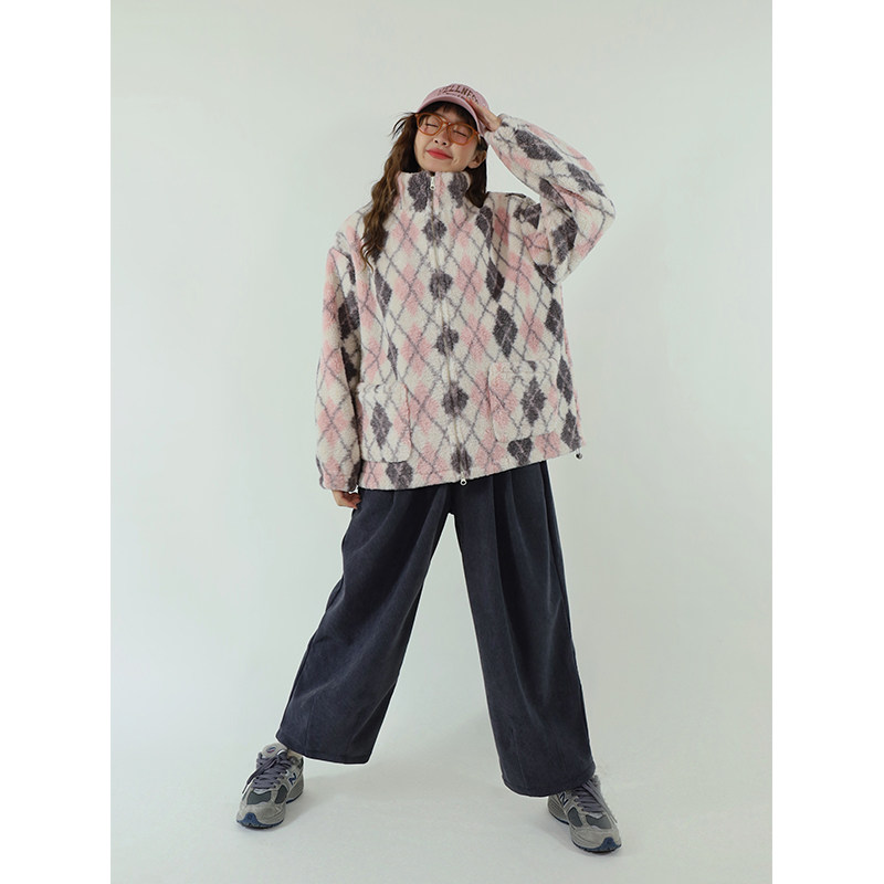 📚 12.9Seagulls2023秋冬新品日系灰粉菱形格立领加厚加绒外套小个子