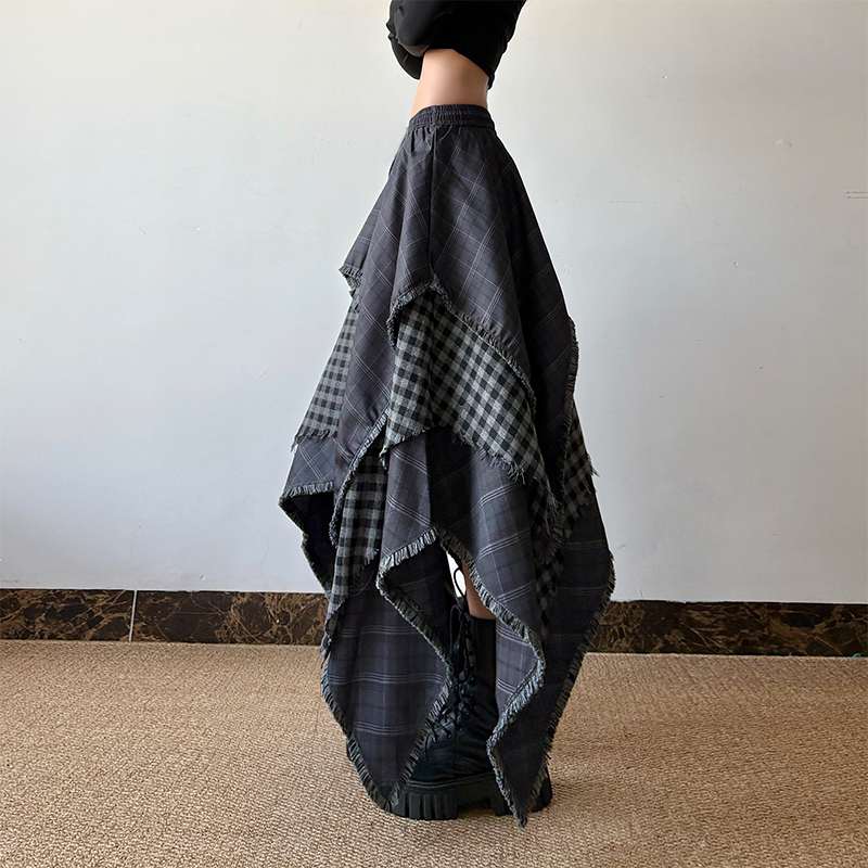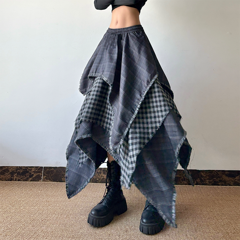 📚 gagaopt格纹不规则拼接中长款半身裙女高腰毛边复古假两件A字裙女