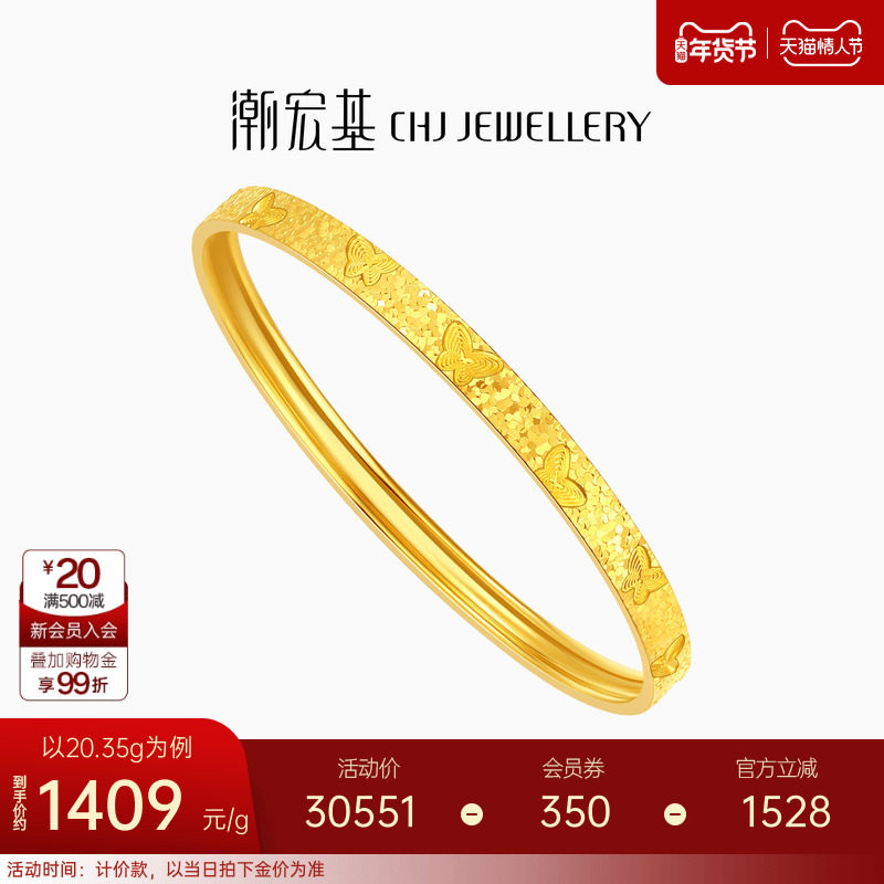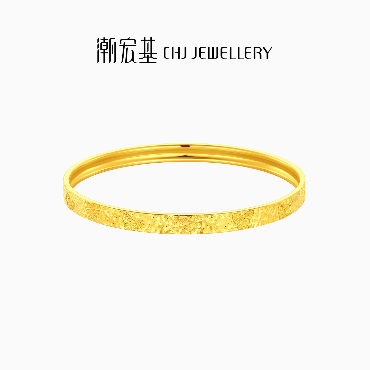 📚 潮宏基高光金蝴蝶黄金手镯爆闪碎碎冰足金方镯结婚三金礼物女计价
