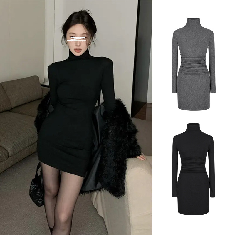 📚 MosesQueen魔西女王黑色半高领长袖连衣裙春秋修身磨毛包臀短裙子