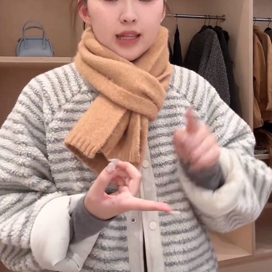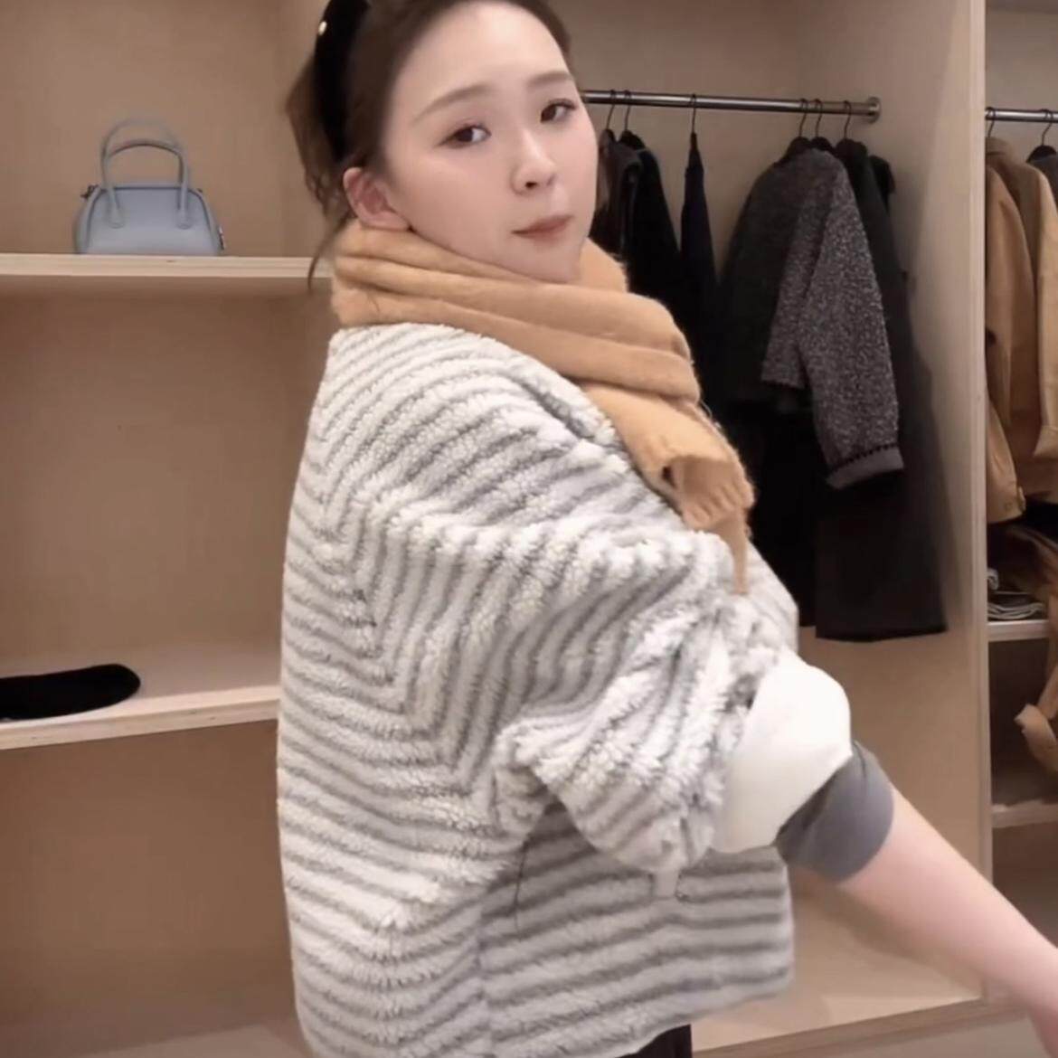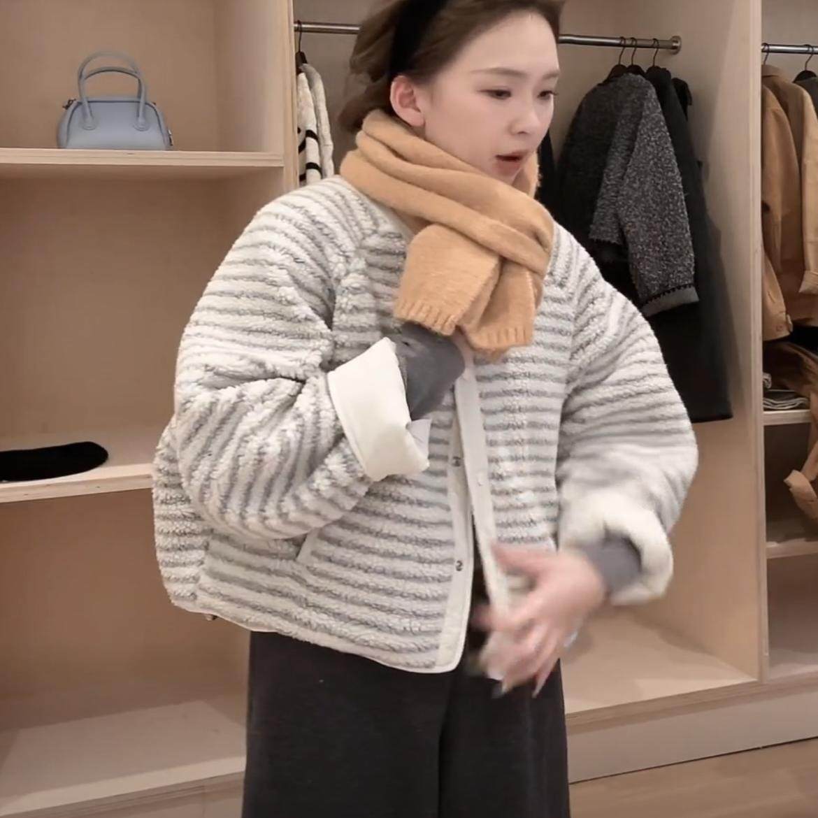 📚 韩国东大门新款春季2025两面穿圆领条纹宽松百搭羊羔毛保暖外套女