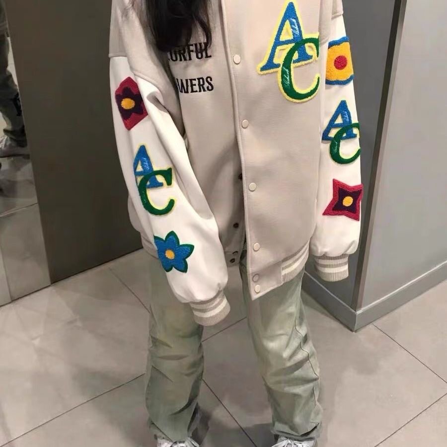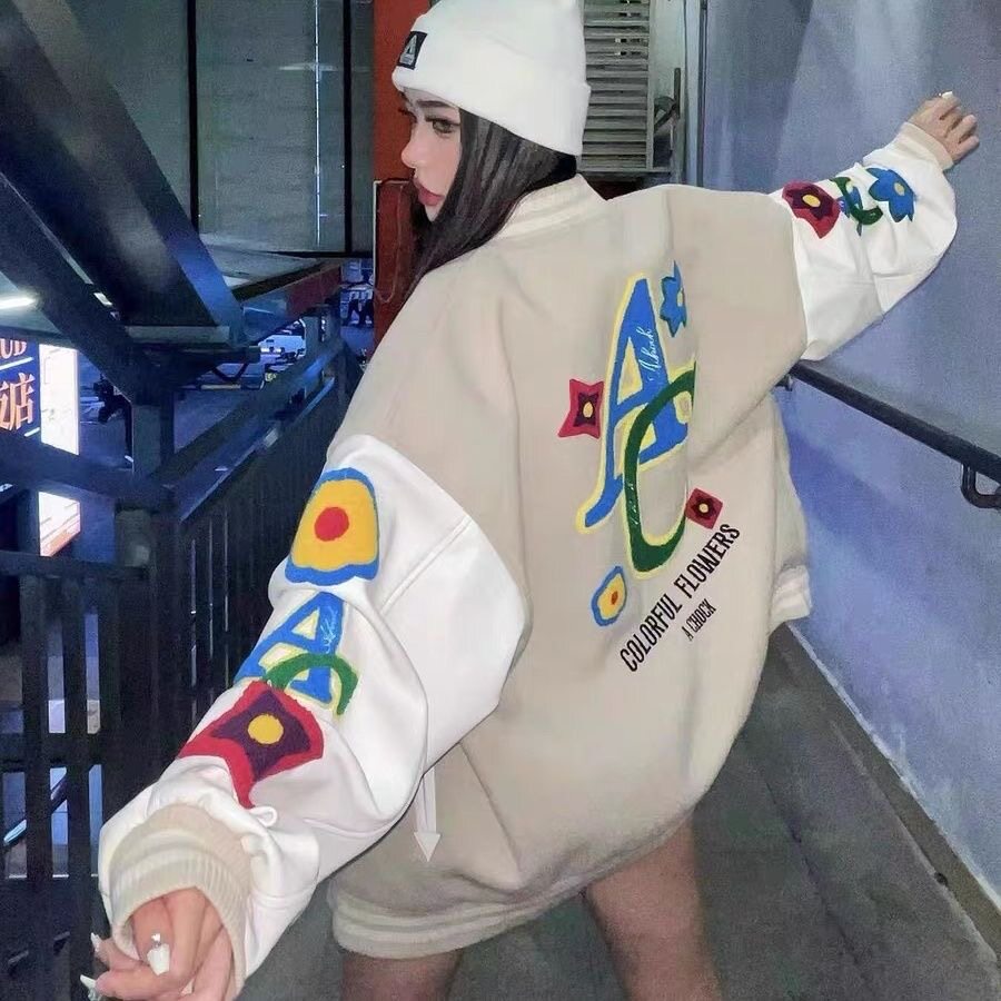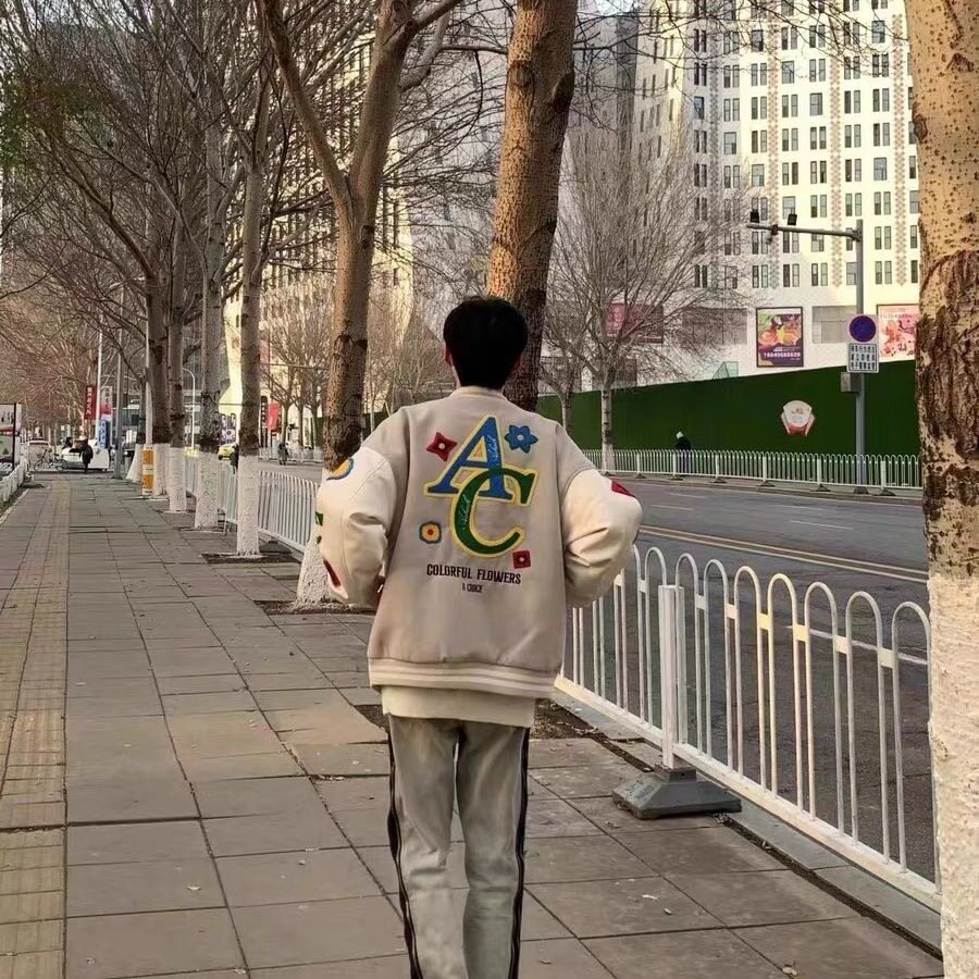 📚 Achock美式碎花毛巾绣植绒夹克杏色单排扣棒球服男女潮