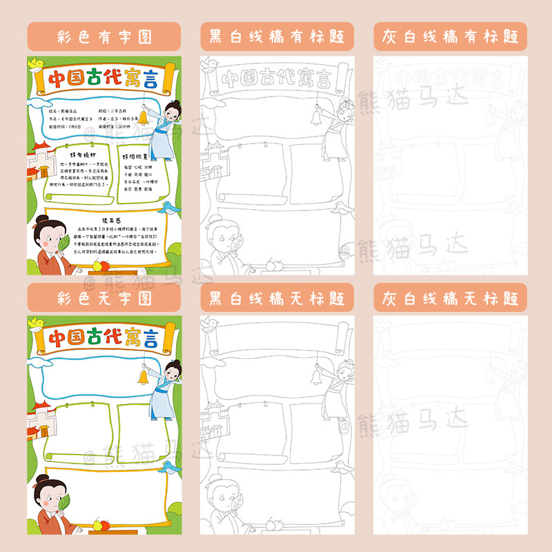 📚 372 熊猫马达 中国古代寓言故事阅读记录卡手抄报三年级小报线稿