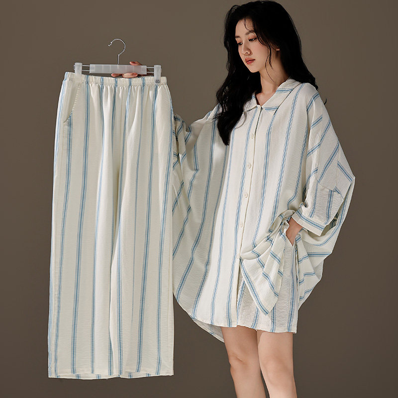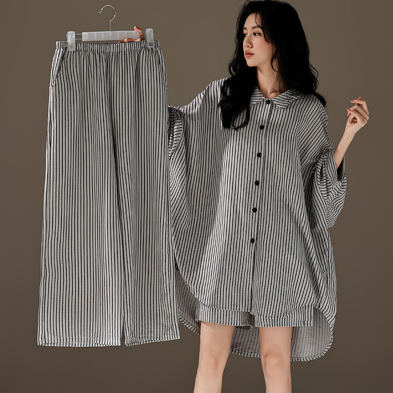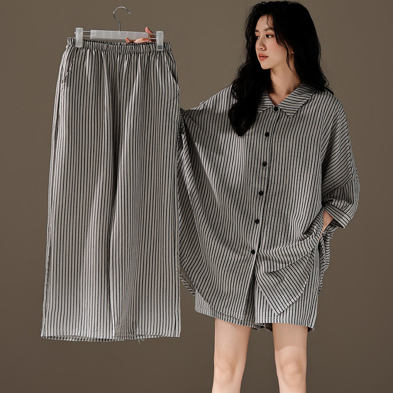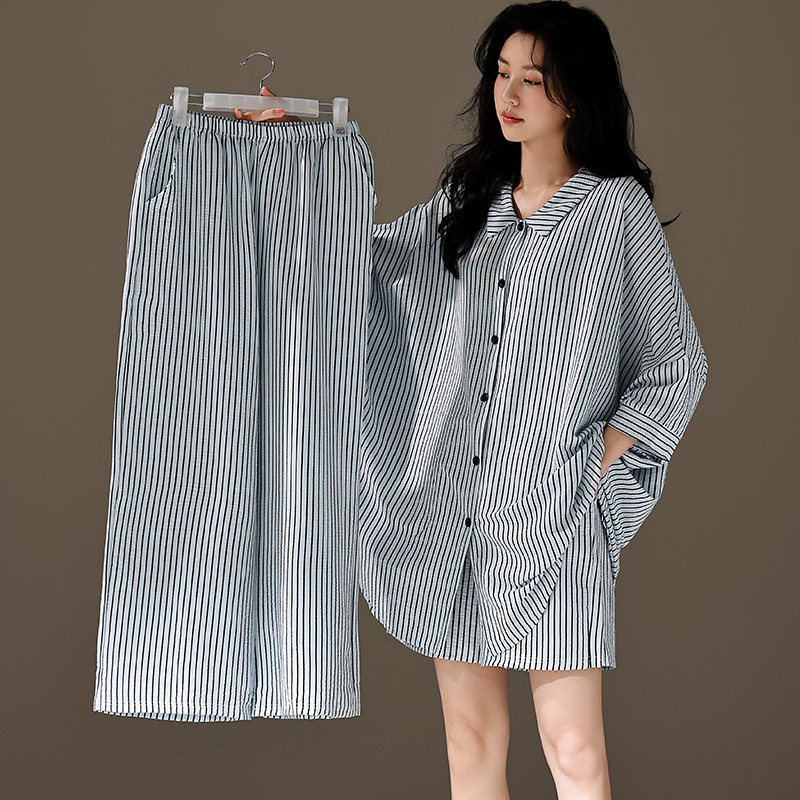📚 夏天三件套睡衣女春秋款2024新款衬衫式短袖休闲大码云朵棉家居服