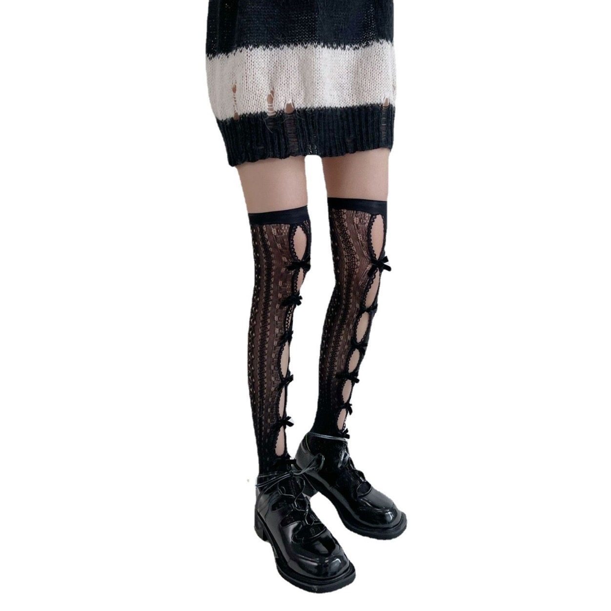 📚 黑底白蝴蝶结过膝袜手工镂空显瘦辣妹高筒袜子洛丽塔蕾丝大腿袜女