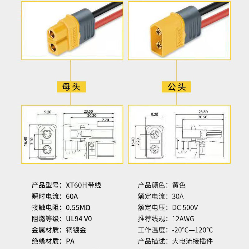 📚 车充载点烟器母座转XT60公母电源线大功率连接器航模电池充电线