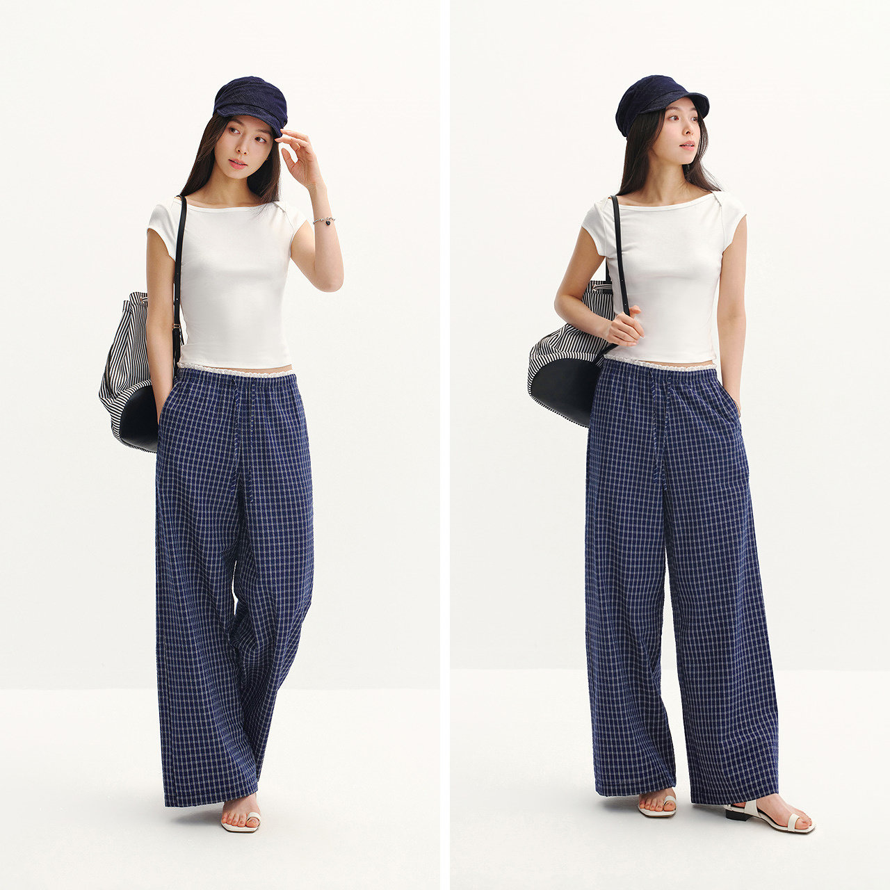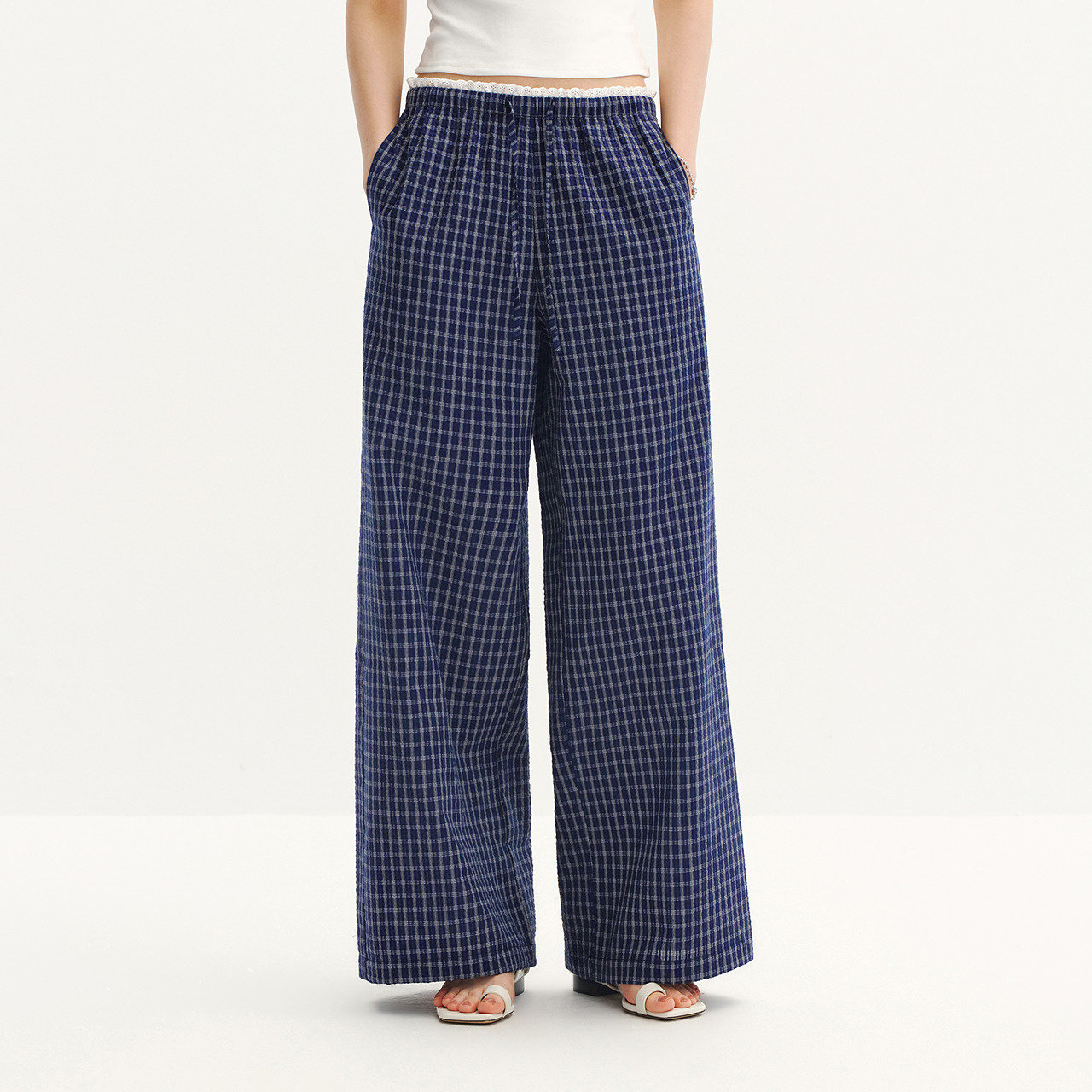 📚 森马休闲裤女夏盐缩格子肌理花边长裤2026新款文艺慵懒温柔阔腿裤
