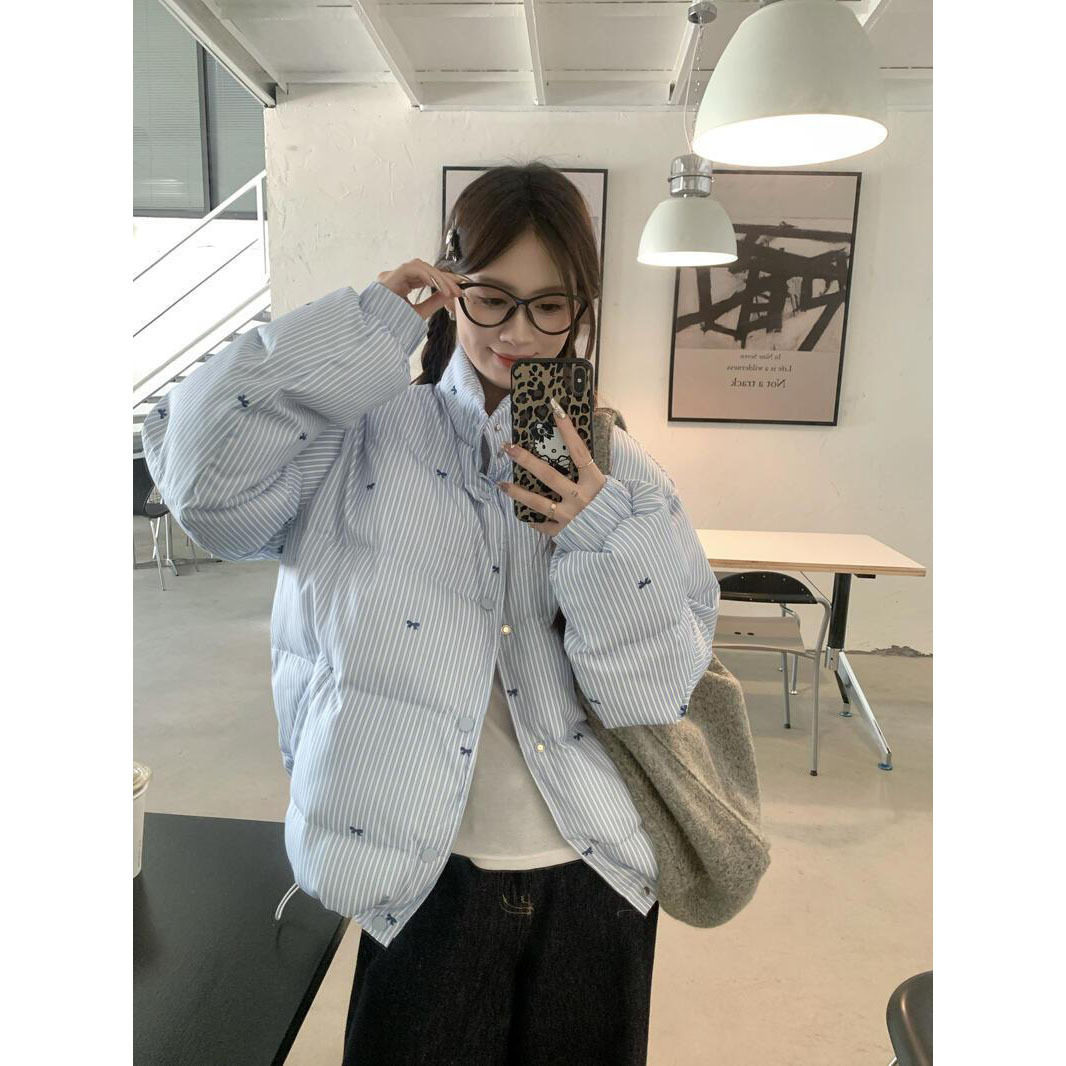 📚 日韩vibe风条纹蝴蝶结棉服冬季新款设计感蓝色潮百搭加厚保暖外套