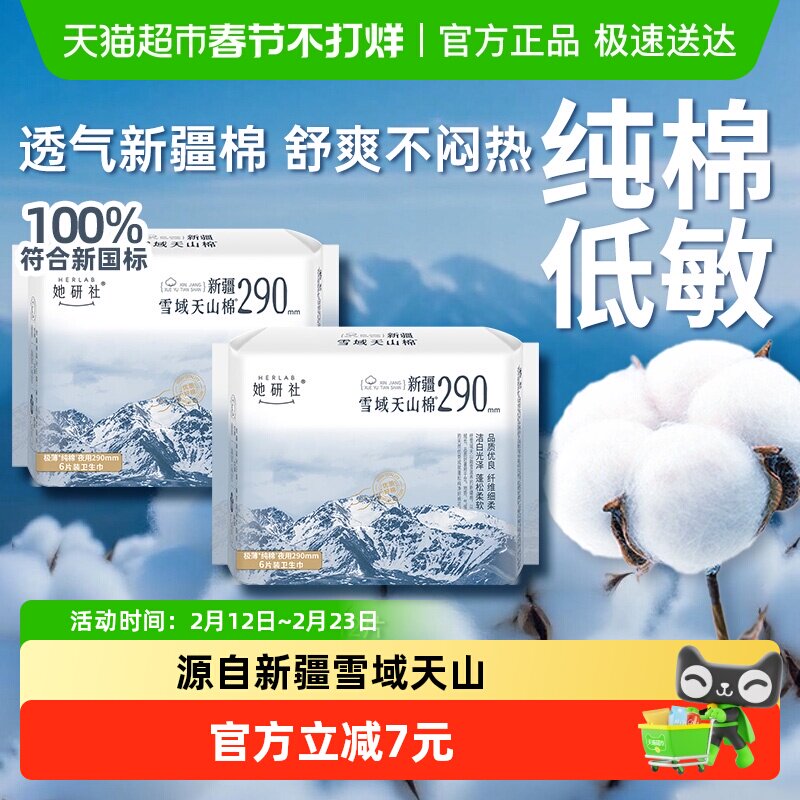📚 她研社卫生巾新疆雪域天山棉夜用量大日用透气不闷290mm*2包
