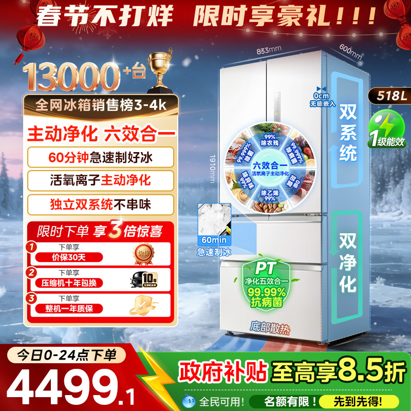 📚 美的华凌神机小宙斯518双系统超薄零嵌自动制冰法式四门家用冰箱